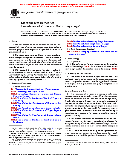 5.2 Test Method D2059 for the determination of the resistance of zippers to salt spray is considered satisfactory for acceptance testing of commercial shipments of zippers because the test method is used extensively in the trade for acceptance testing.
