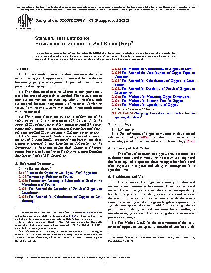 1.1 This test method covers the determination of the resistance of all types of zippers to corrosion and their ability to function properly after exposure of specified duration in a prescribed salt spray.