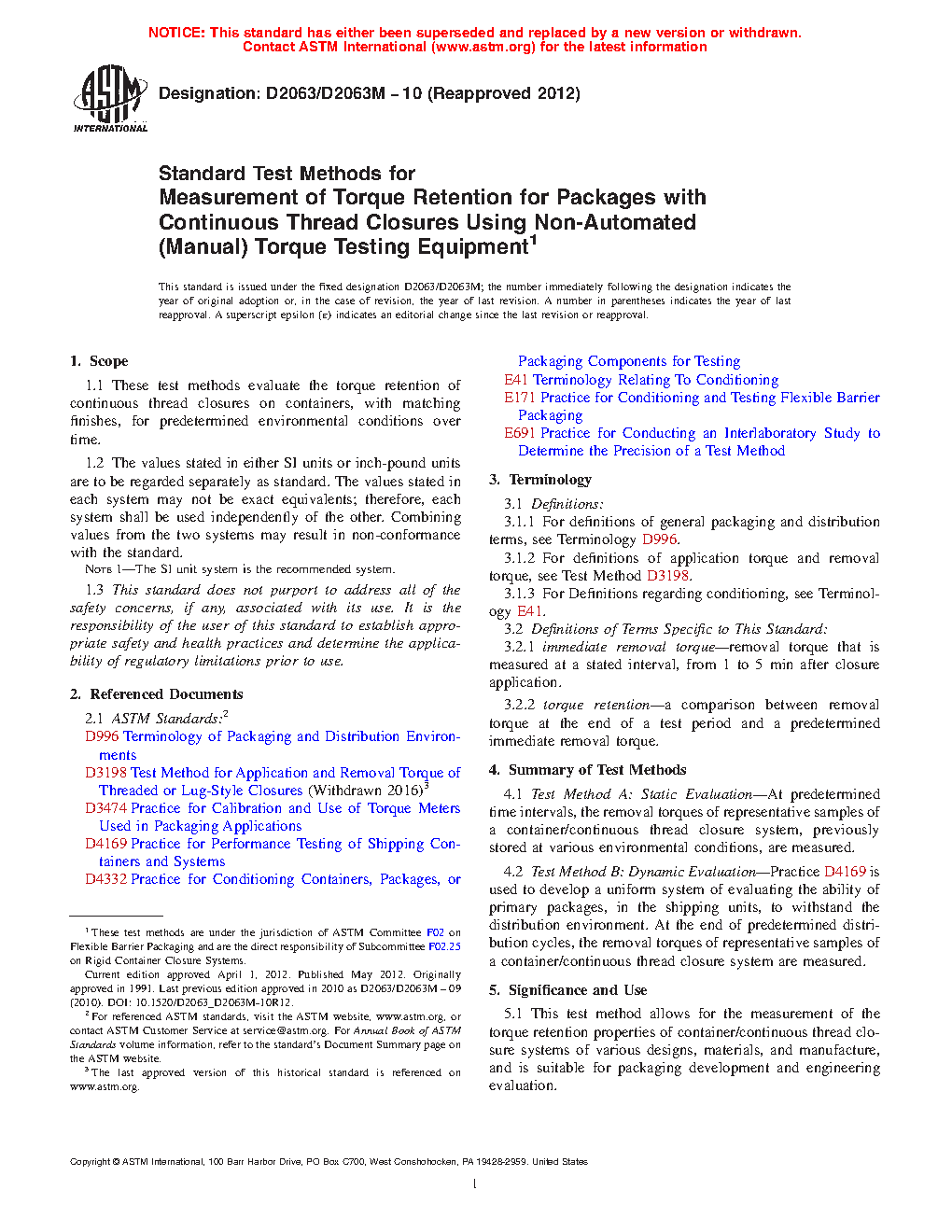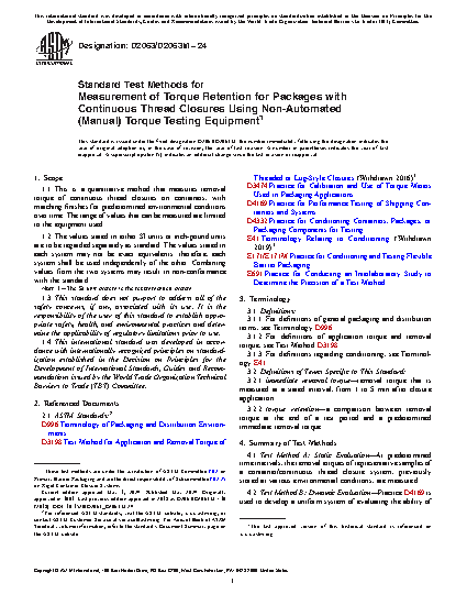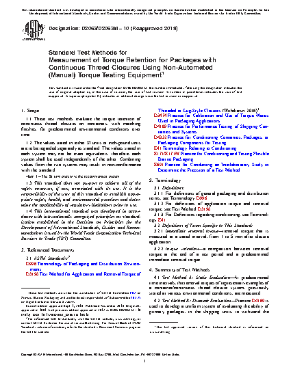 This test method measures torque retention properties of container/continuous thread closure systems with the use of a non-automated, spring torque-meter (with either a dial indicator or a digital readout) or a torque wrench.