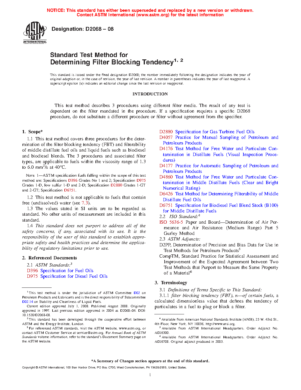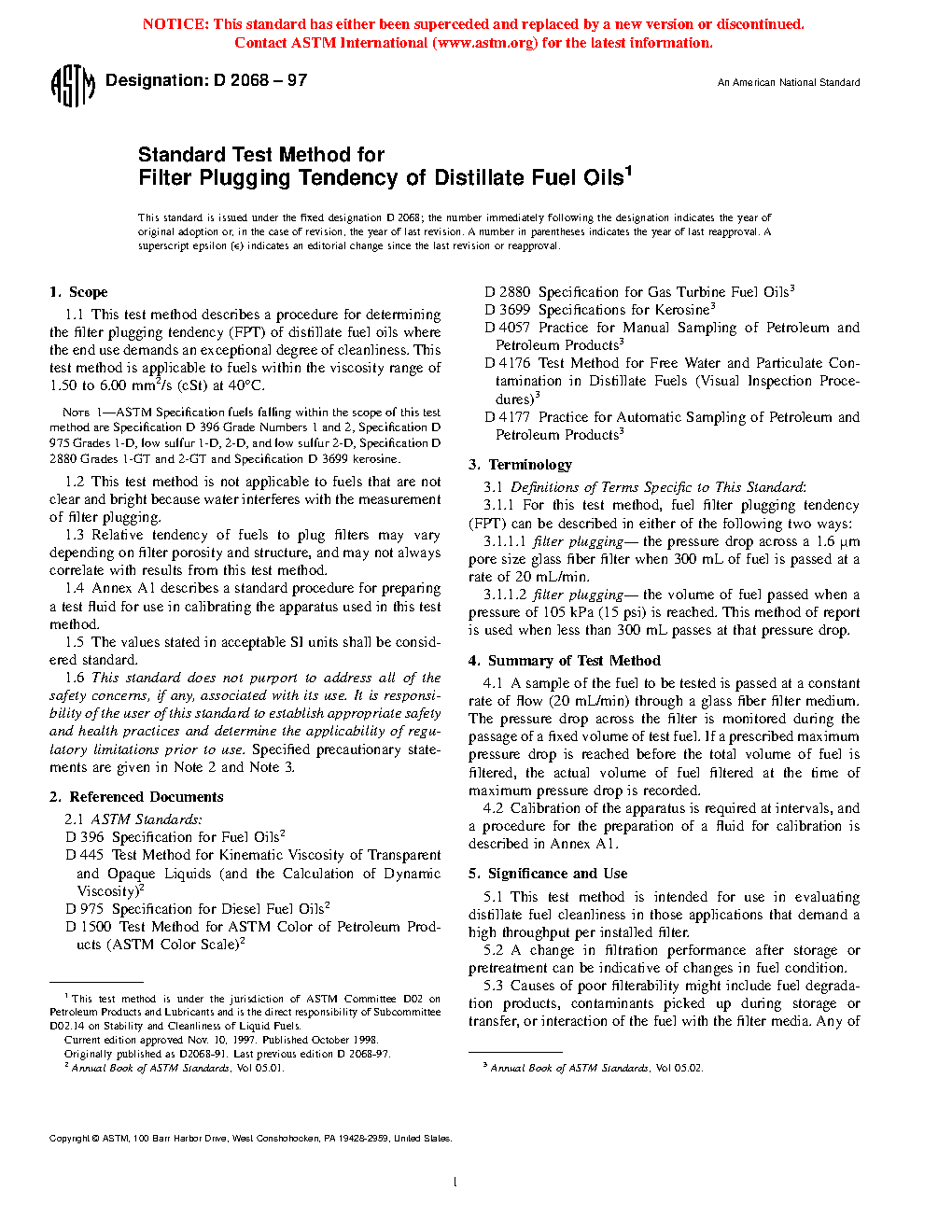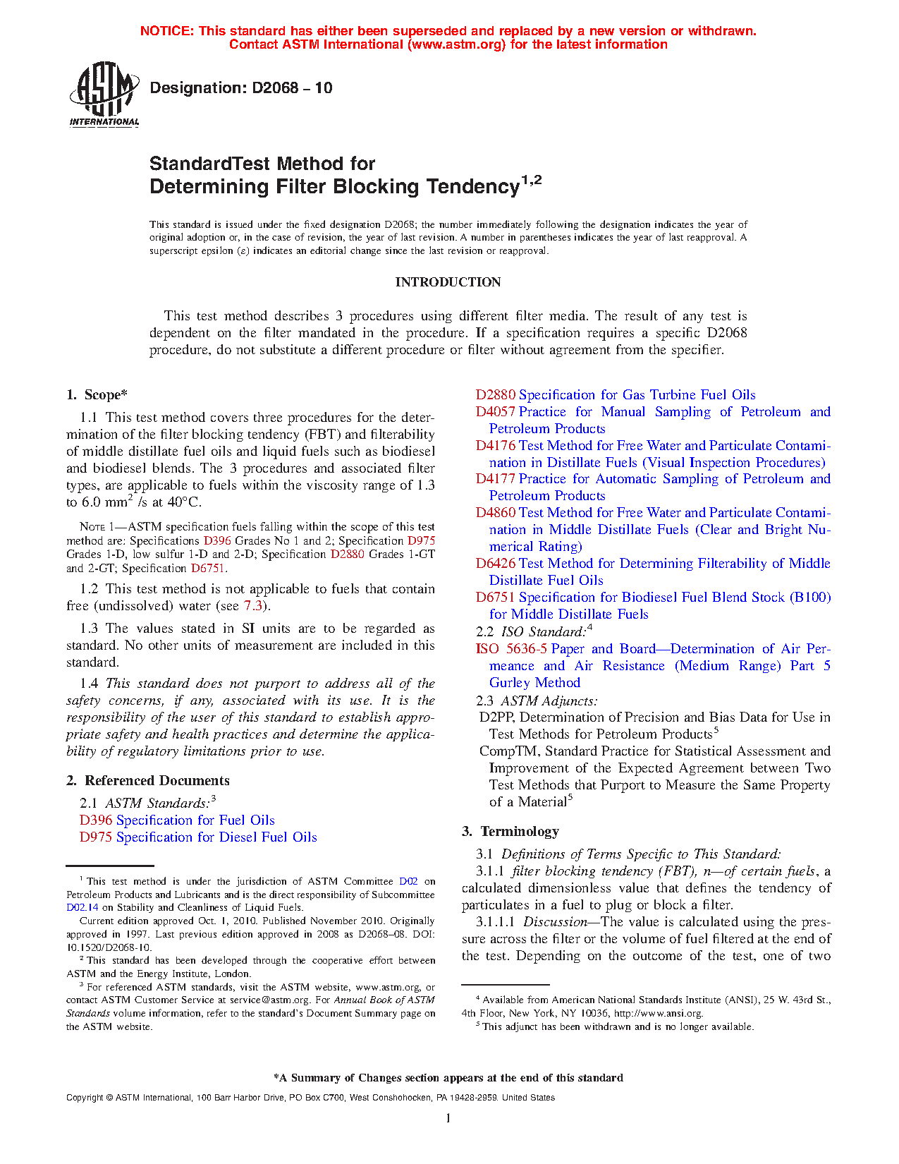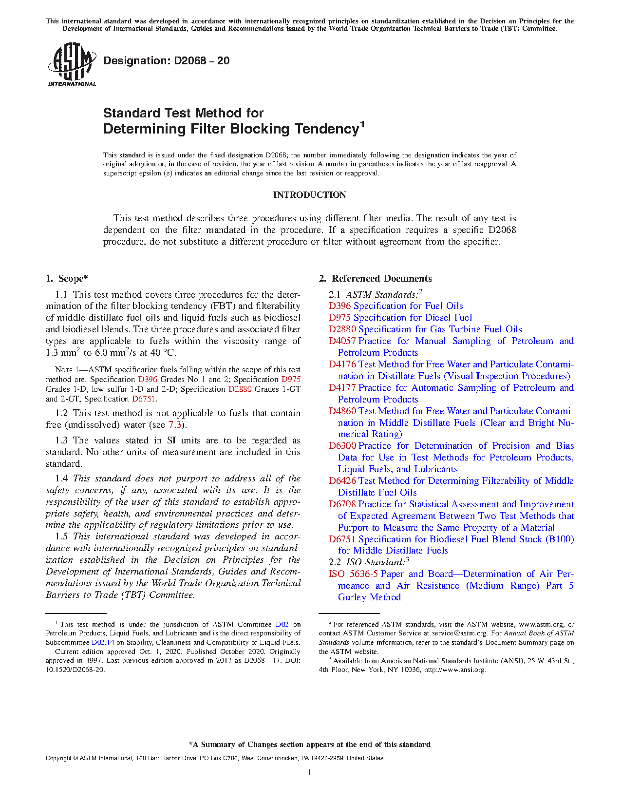1.1 This test method covers three procedures for the determination of the filter blocking tendency (FBT) and filterability of middle distillate fuel oils and liquid fuels such as biodiesel and biodiesel blends. The 3 procedures and associated filter types, are applicable to fuels within the viscosity range of 1.3 to 6.0 mm2/s at 40°C.