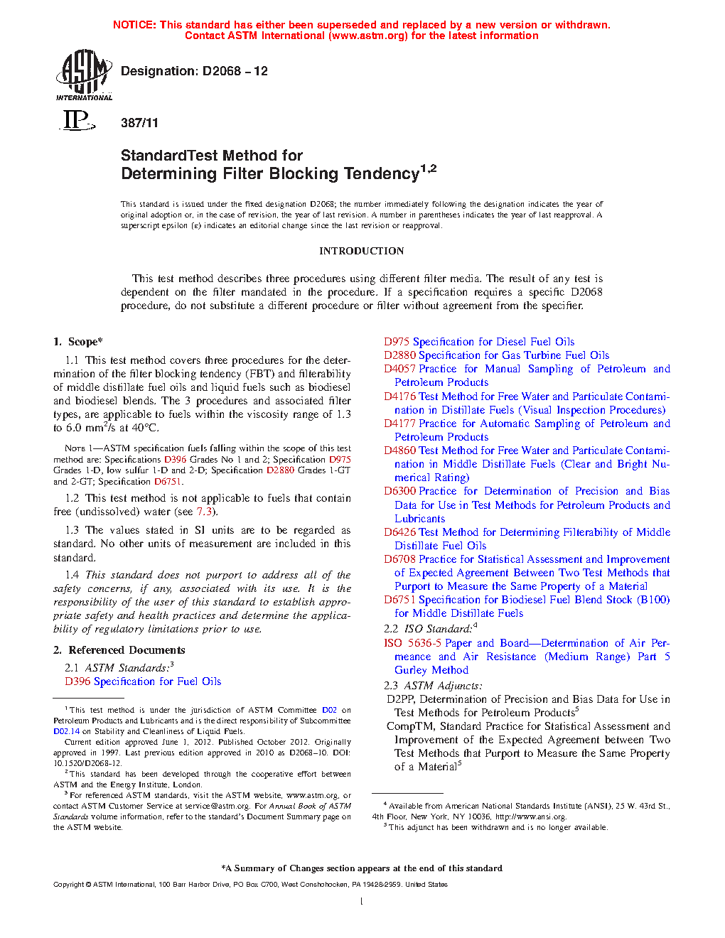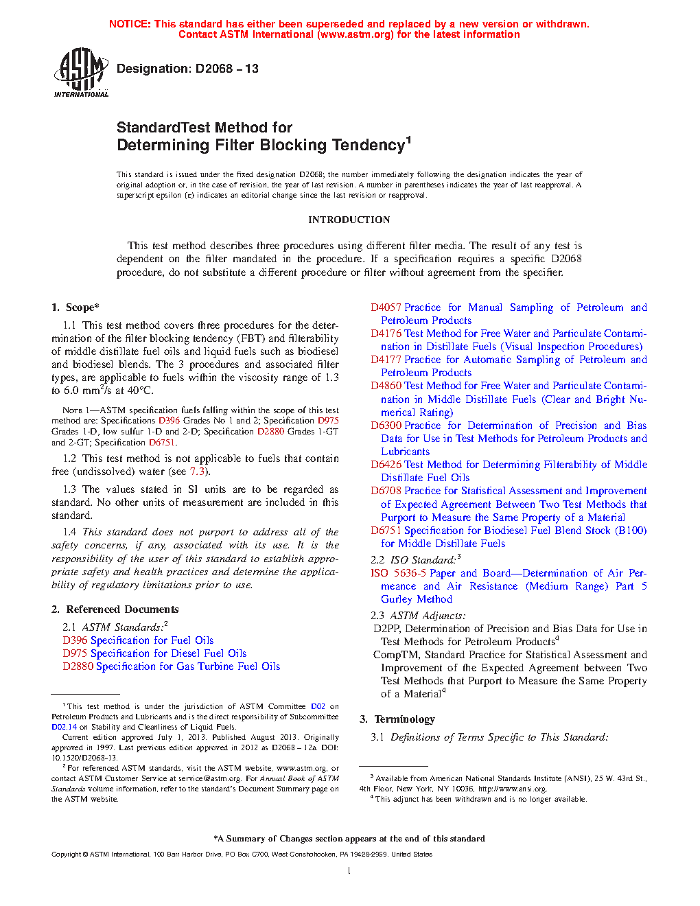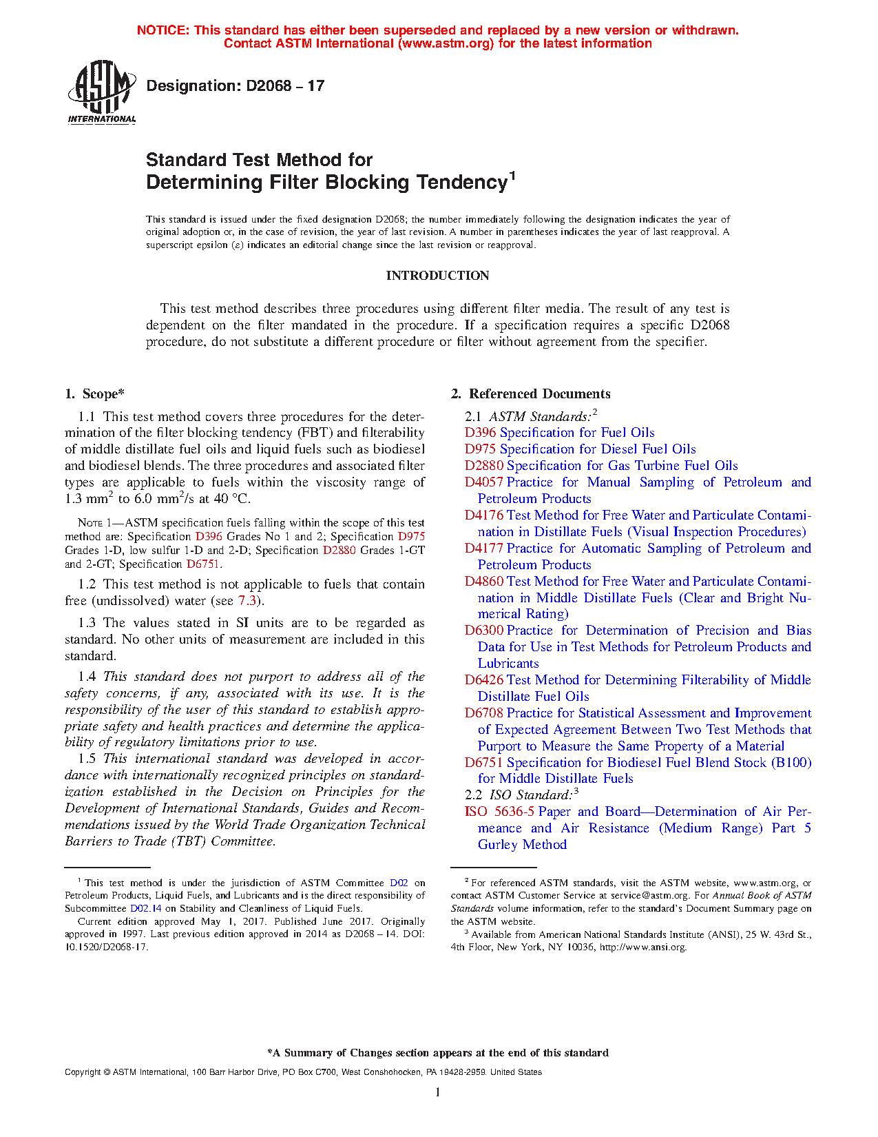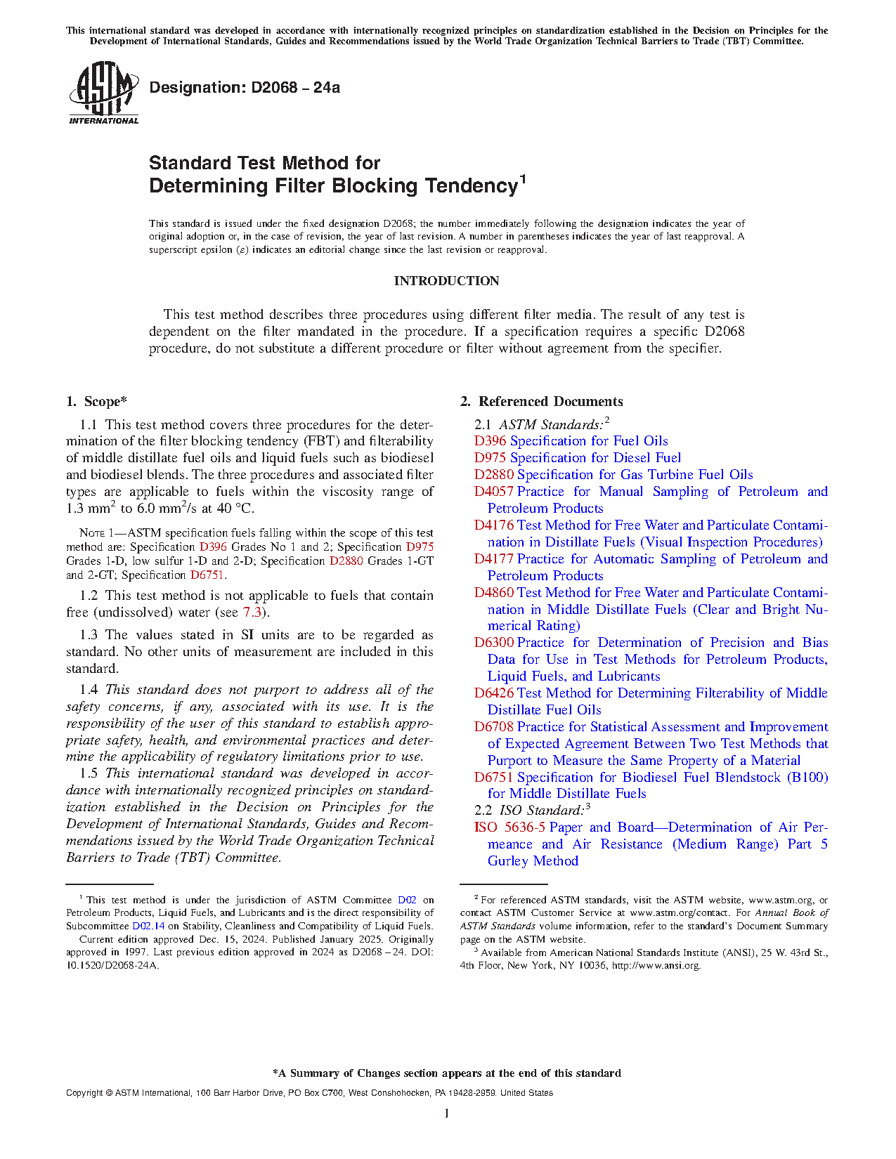 1.1 This test method covers three procedures for the determination of the filter blocking tendency (FBT) and filterability of middle distillate fuel oils and liquid fuels such as biodiesel and biodiesel blends. The 3 procedures and associated filter types, are applicable to fuels within the viscosity range of 1.3 to 6.0 mm2/s at 40°C.