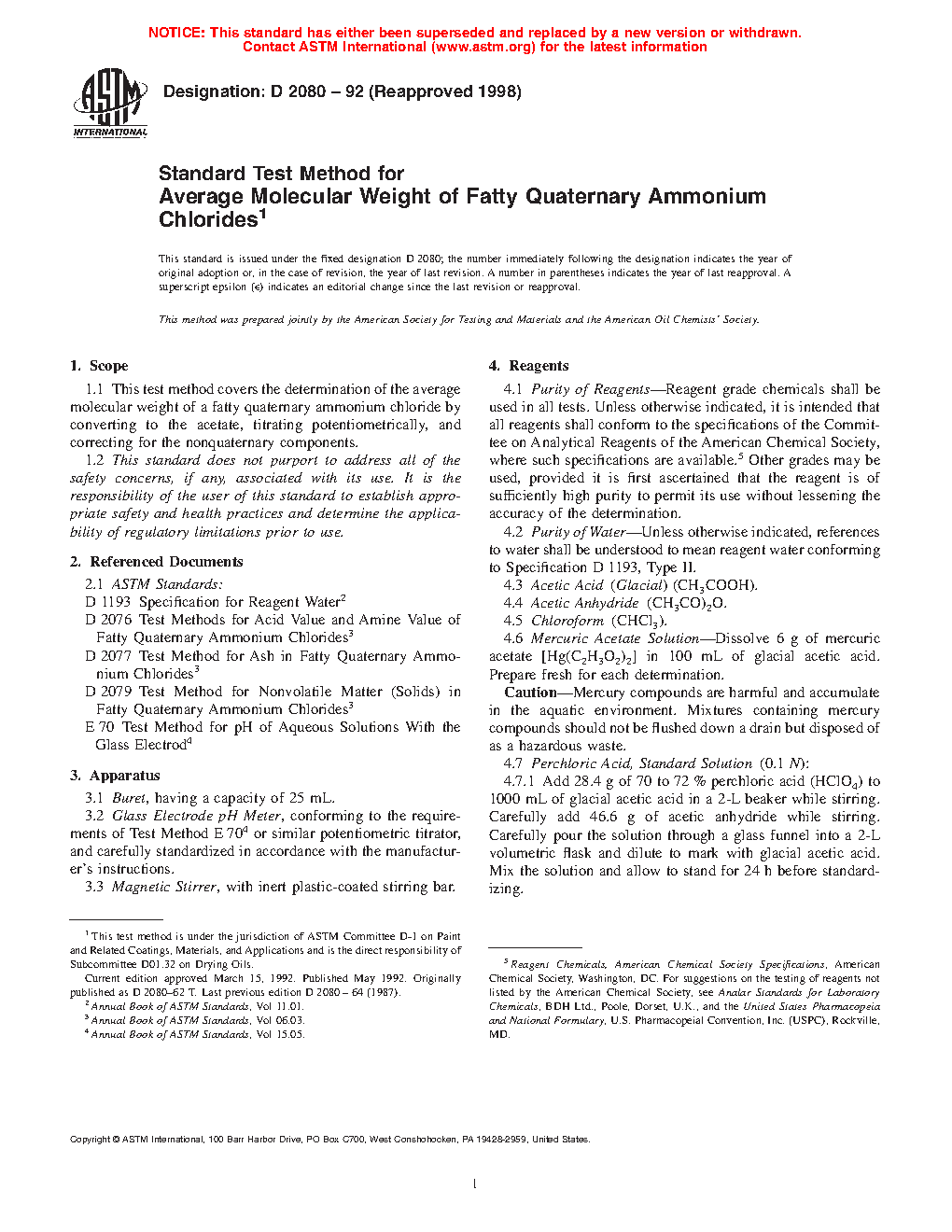 Standard Test Method for Average Molecular Weight of Fatty Quaternary Ammonium Chlorides (Withdrawn 2007)