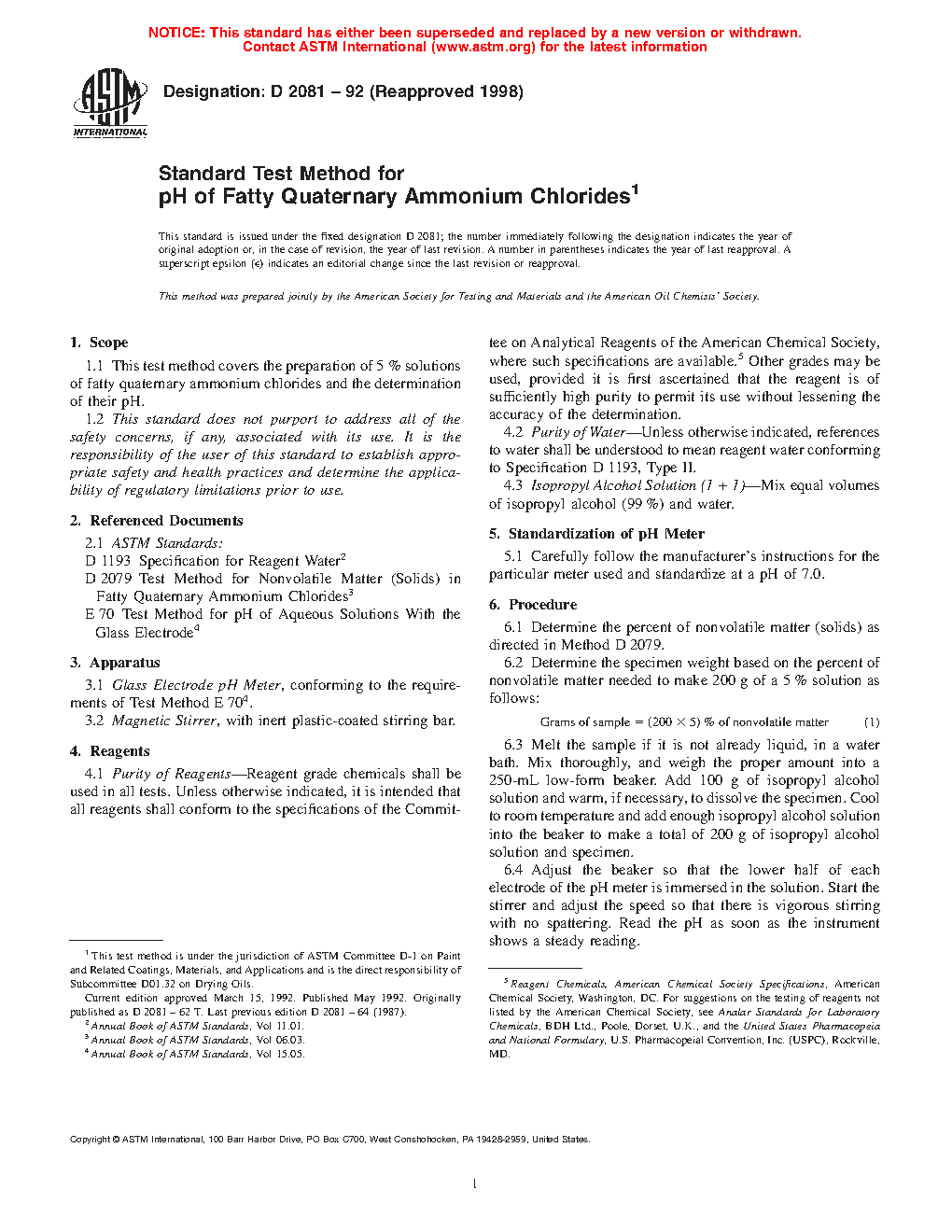 Standard Test Method for pH of Fatty Quaternary Ammonium Chlorides (Withdrawn 2007)