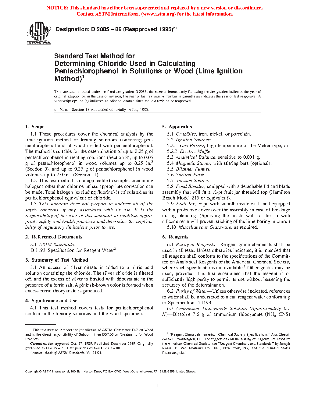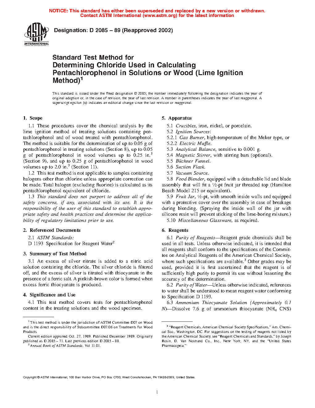 1.1 These procedures cover the chemical analysis by the lime ignition method of treating solutions containing pentachlorophenol and of wood treated with pentachlorophenol. The method is suitable for the determination of up to 0.05 g of pentachlorophenol in treating solutions (Section 8), up to 0.05 g of pentachlorophenol in wood volumes up to 0.25 in. (Section 9), and up to 0.25 g of pentachlorophenol in wood volumes up to 2.0 in. (Section 11).
