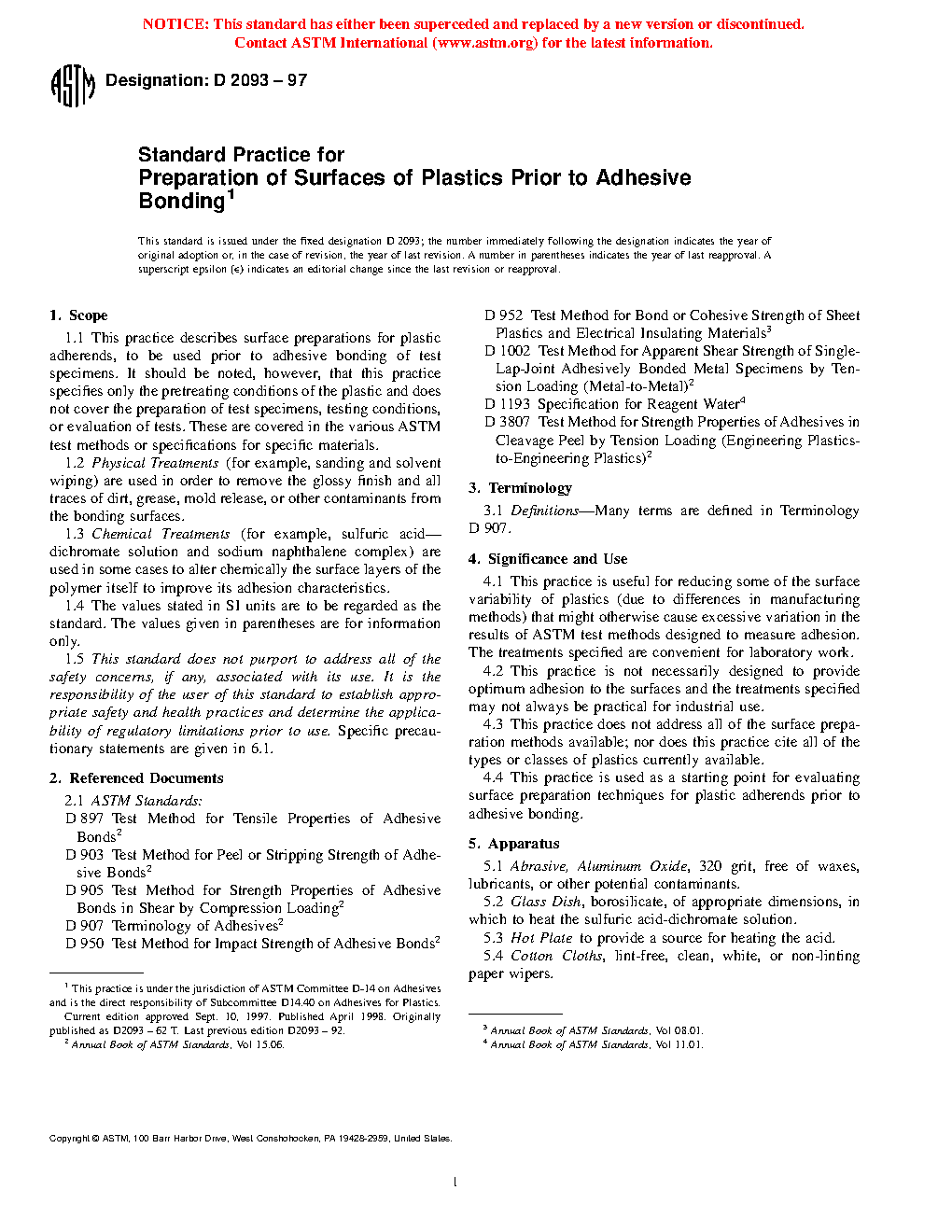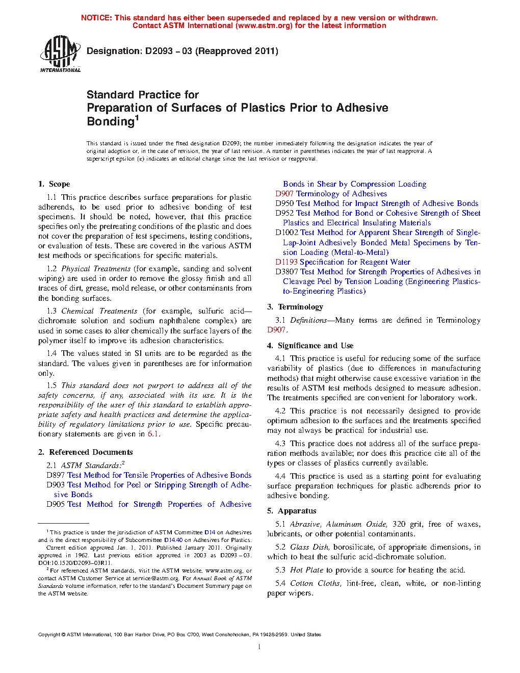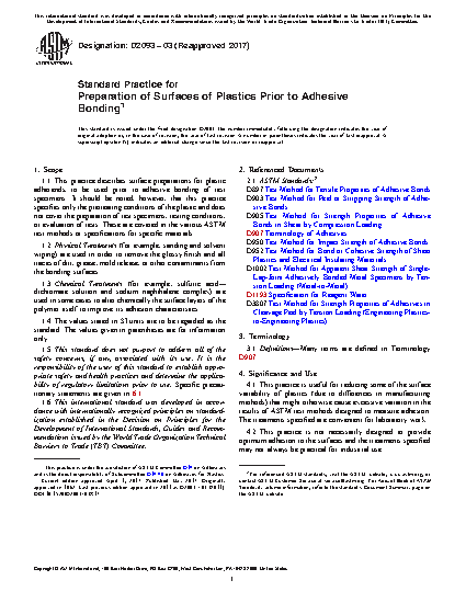 1.1 This practice describes surface preparations for plastic adherends, to be used prior to adhesive bonding of test specimens. It should be noted, however, that this practice specifies only the pretreating conditions of the plastic and does not cover the preparation of test specimens, testing conditions, or evaluation of tests. These are covered in the various ASTM test methods or specifications for specific materials.