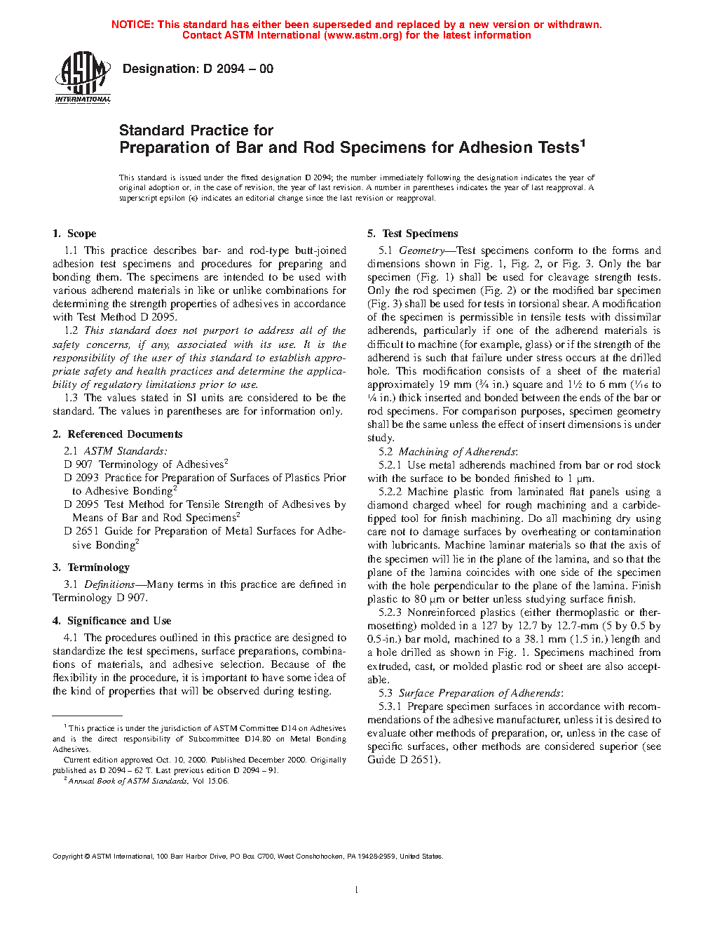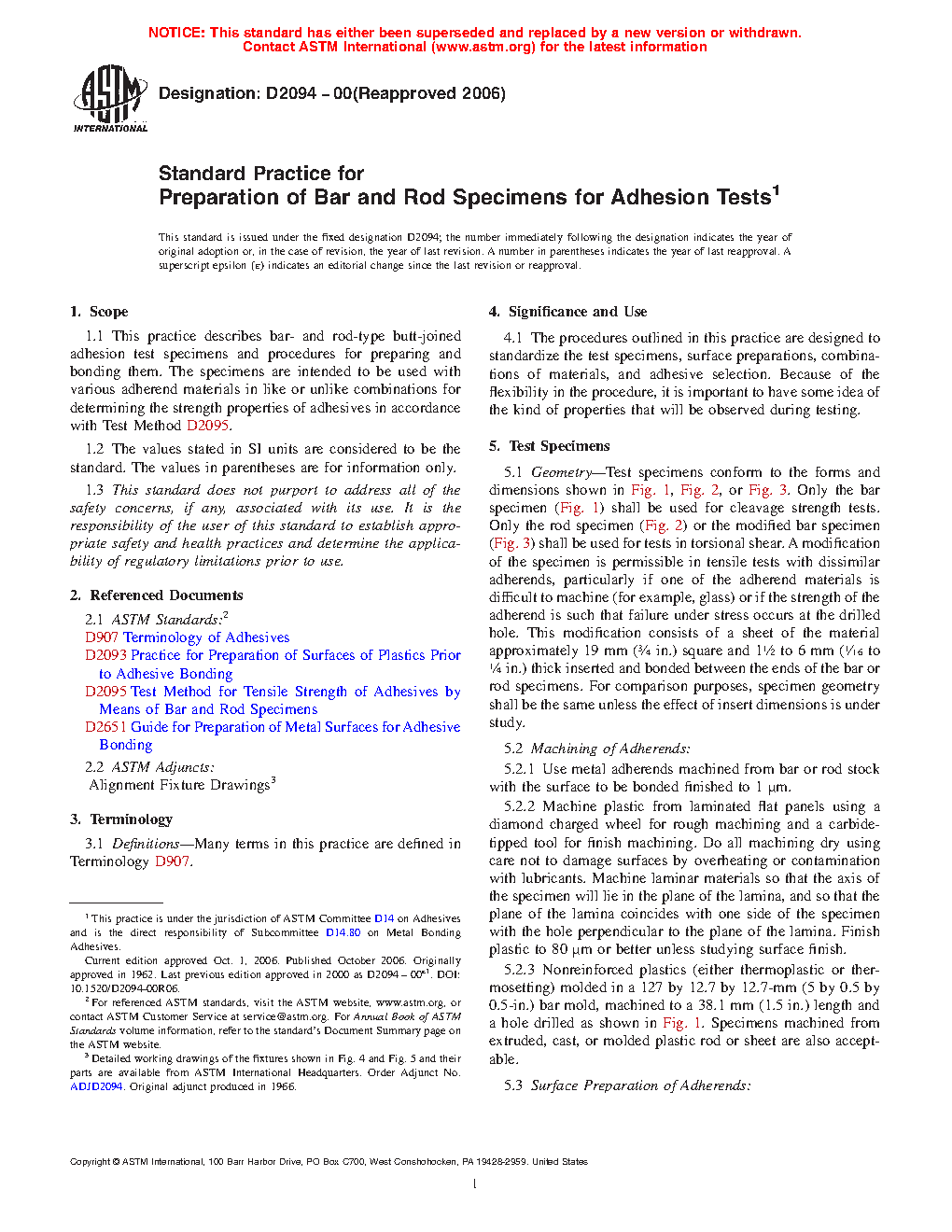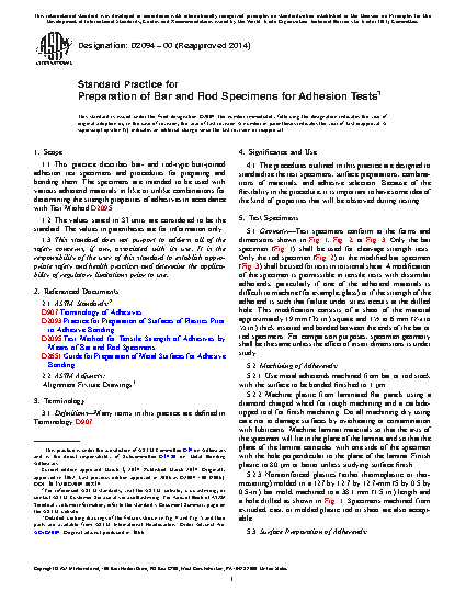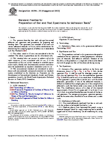 1.1 This practice describes bar- and rod-type butt-joined adhesion test specimens and procedures for preparing and bonding them. The specimens are intended to be used with various adherend materials in like or unlike combinations for determining the strength properties of adhesives in accordance with Test Method D2095.