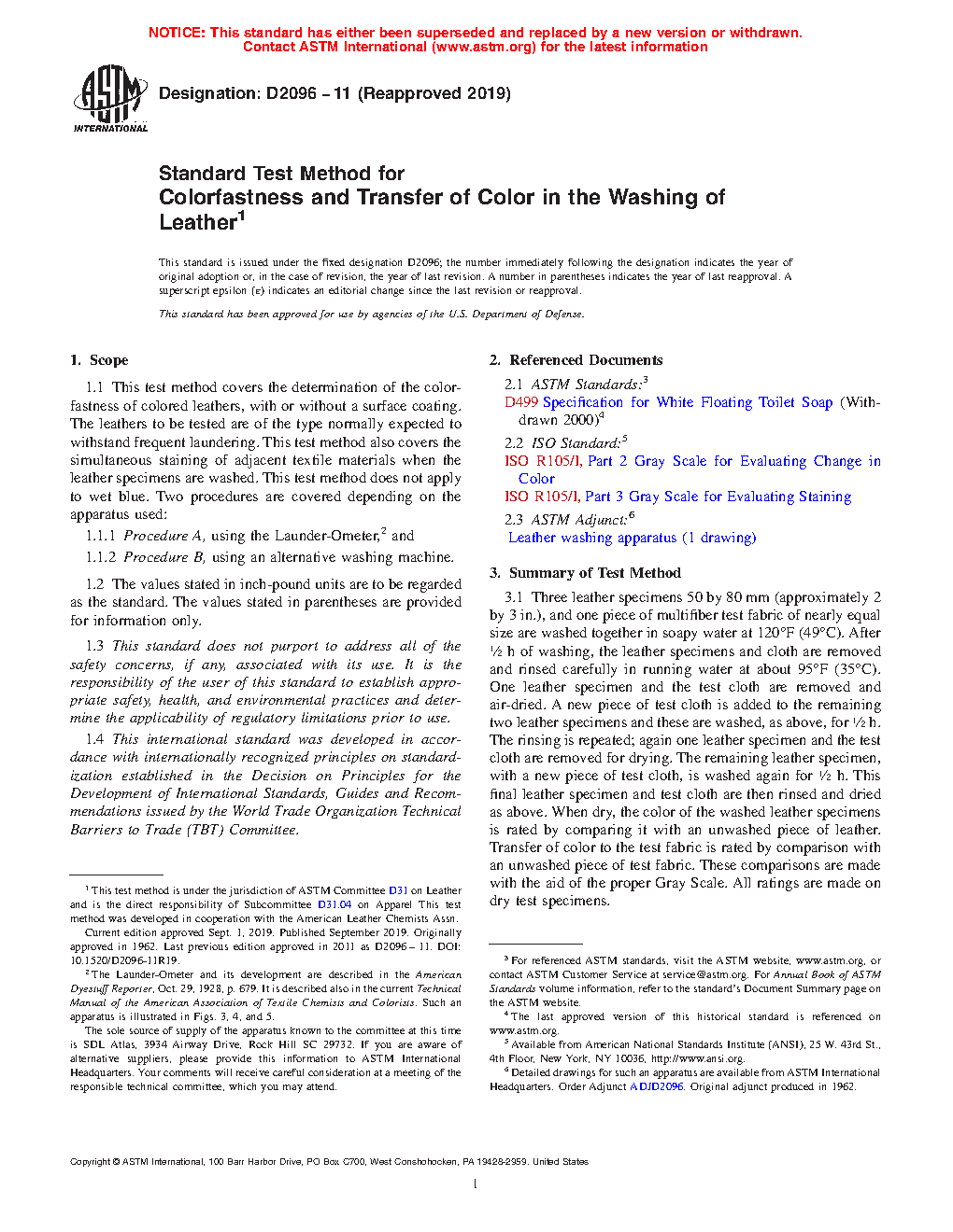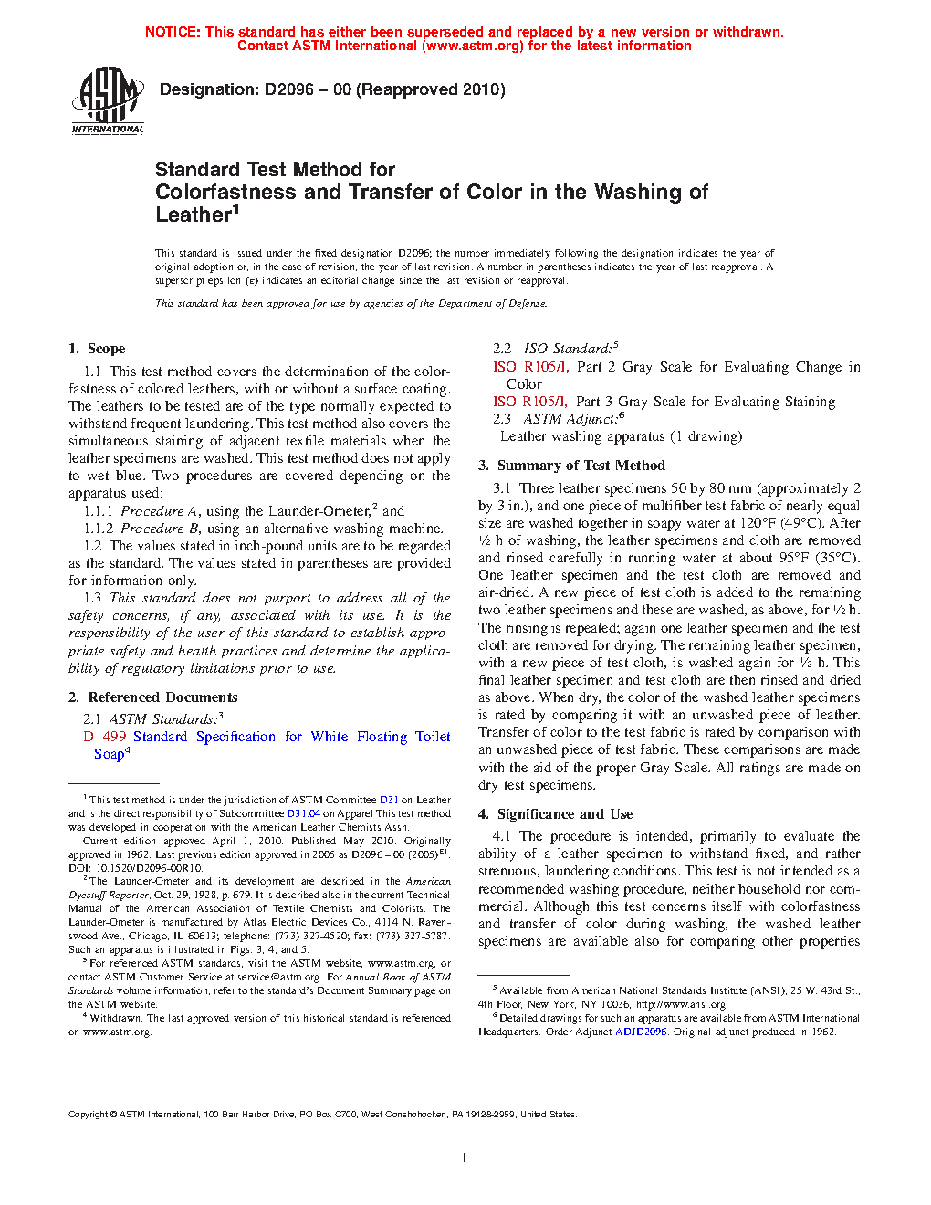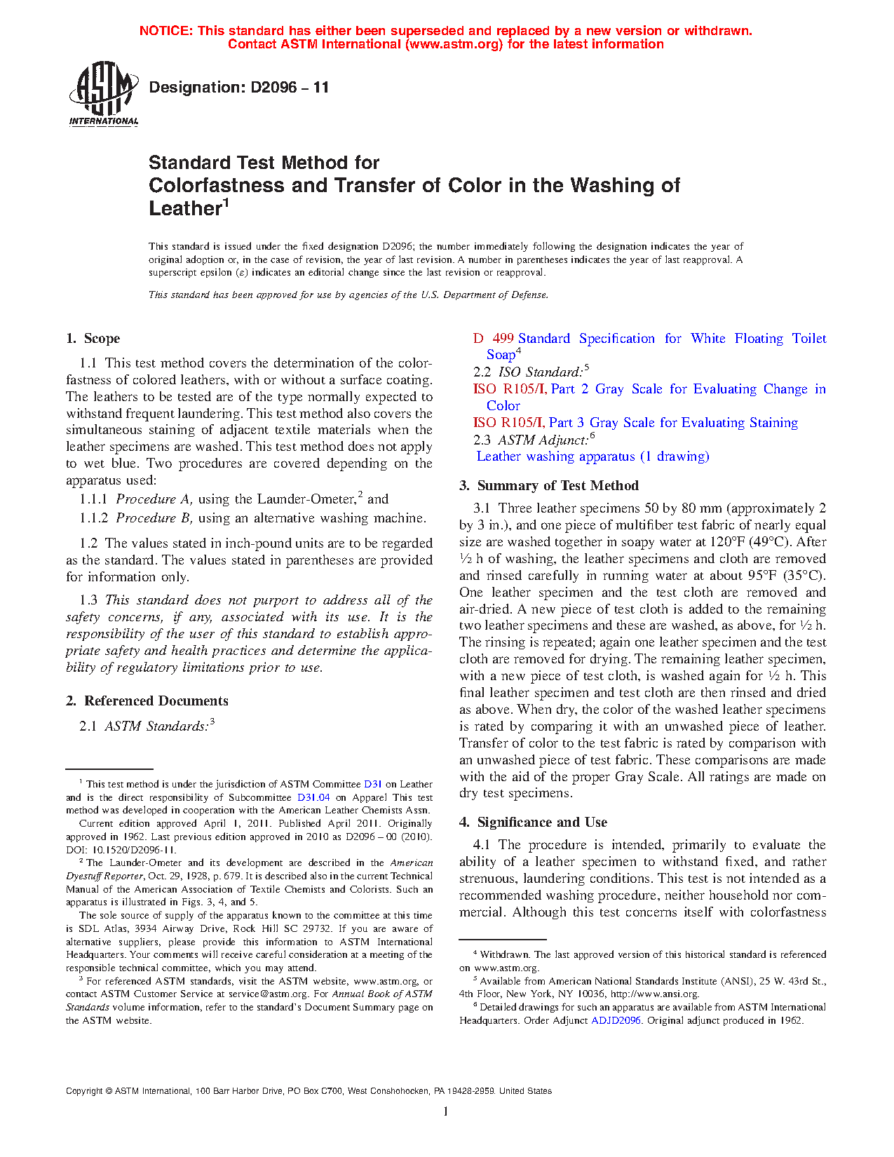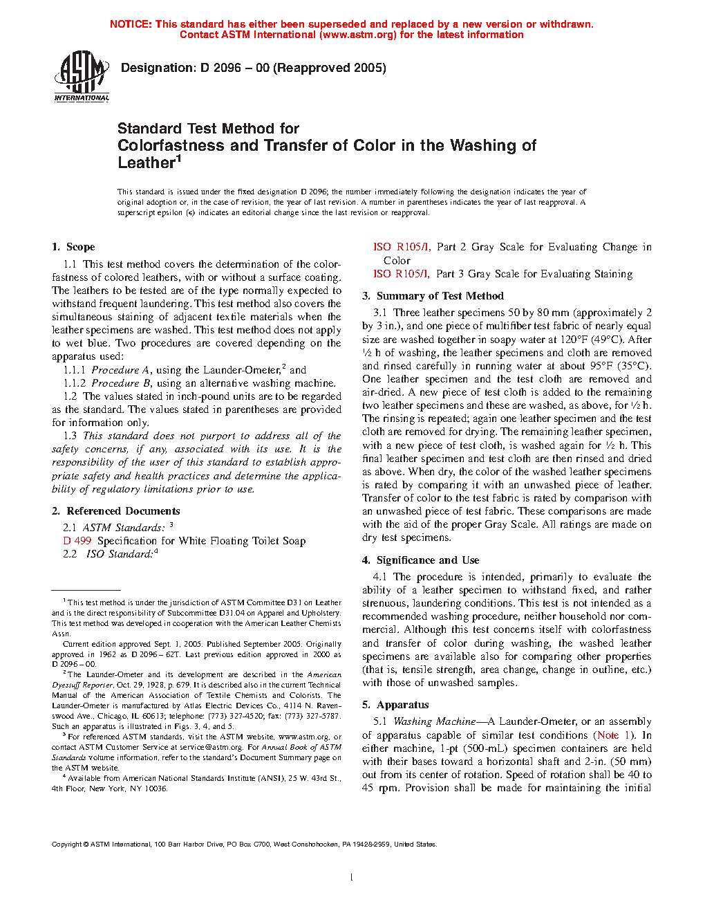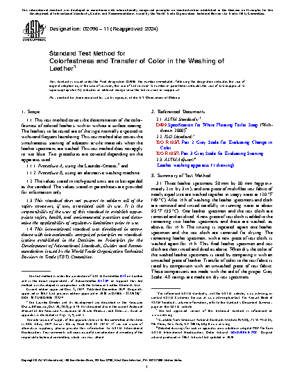 1.1 This test method covers the determination of the colorfastness of colored leathers, with or without a surface coating. The leathers to be tested are of the type normally expected to withstand frequent laundering. This test method also covers the simultaneous staining of adjacent textile materials when the leather specimens are washed. This test method does not apply to wet blue. Two procedures are covered depending on the apparatus used: