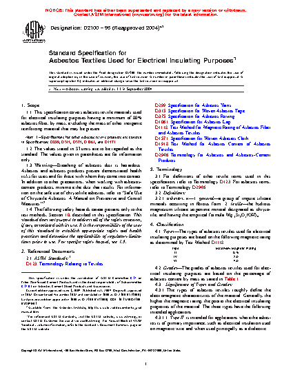 1.1 This specification covers asbestos textile materials used for electrical insulating purposes having a minimum of 80% asbestos fiber, by mass, excluding the mass of other inorganic reinforcing material that may be present.