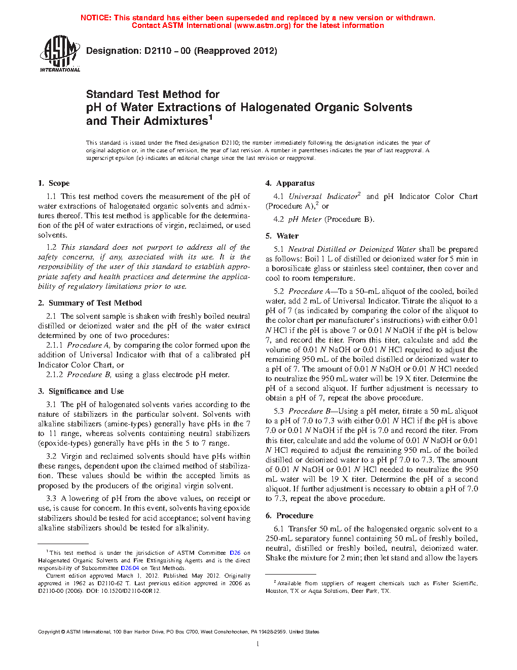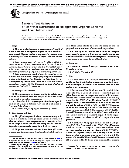 1.1 This test method covers the measurement of the pH of water extractions of halogenated organic solvents and admixtures thereof. This test method is applicable for the determination of the pH of water extractions of virgin, reclaimed, or used solvents.
