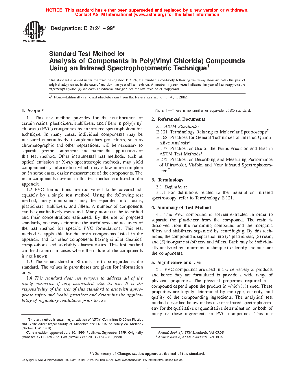 PVC compounds are used in a wide variety of products and hence they are formulated to provide a wide range of physical properties. The physical properties required in a compound depend upon the product in which it is used. These properties are largely determined by the type, quantity, and quality of the compounding ingredients. The analytical test method described below makes use of infrared spectrophotometry for the qualitative or quantitative determination, or both, of many of these ingredients in PVC compounds. This test method may be used for a variety of applications including process control, raw material acceptance, product evaluation, and determination of changes in composition resulting from environmental testing.