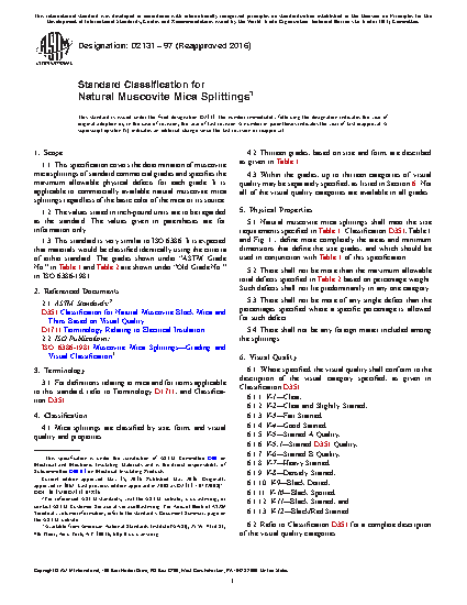 This specification covers the determination of muscovite mica splittings of standard commercial grades and specifies the maximum allowable physical defects for each grade. It is applicable to commercially available natural muscovite mica splittings regardless of the basic color of the mica or its source. This specification covers thirteen grades of mica splittings based on size and form classification. Mica splittings shall meet the specified physical property requirements such as size, thickness, defects, and absence of any foreign matter. Where specified, the visual quality shall conform to the description of the visual category specified such as V-1, V-2, V-3, V-4, V-5, V-5.1, V-6, V-7, V-8, V-9, V-10, V-11, and V-12. The method of sampling of mica splittings in bookform and loose with powder form are specified and method of calculation of defect percentage is given.