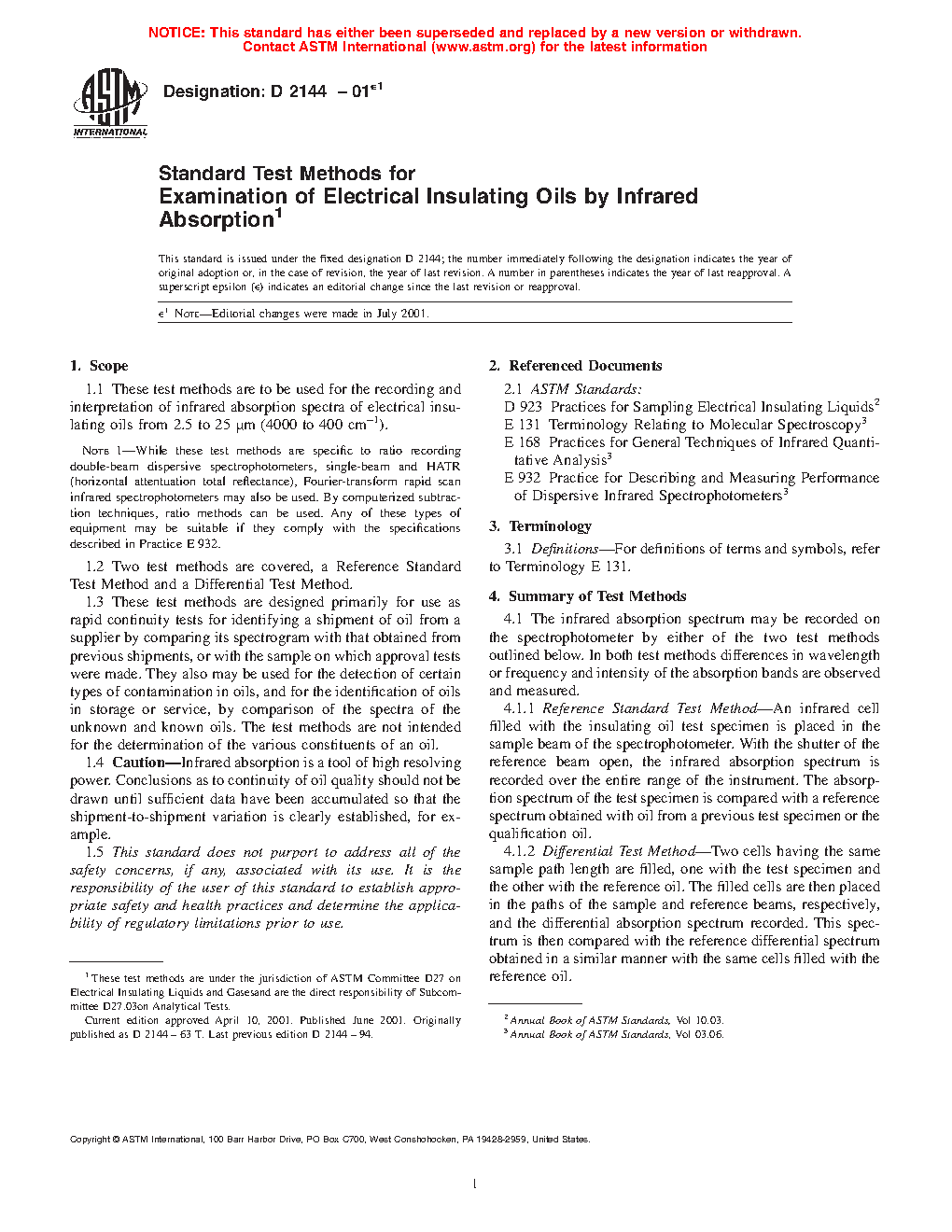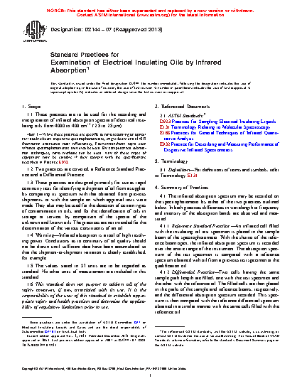 1.1 These test methods are to be used for the recording and interpretation of infrared absorption spectra of electrical insulating oils from 2.5 to 25 µm (4000 to 400 cm-1).