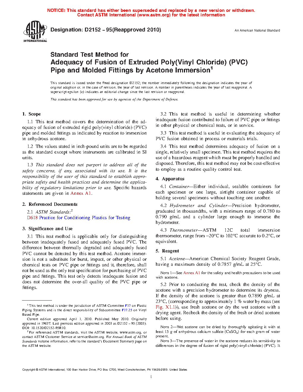 1.1 This test method covers the determination of the adequacy of fusion of extruded rigid poly(vinyl chloride) (PVC) pipe and molded fittings as indicated by reaction to immersion in anhydrous acetone.