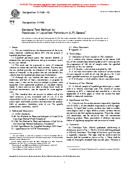 1.1 This test method covers the determination of extraneous materials weathering above 38 °C that are present in liquefied petroleum gases. The extraneous materials will generally be dissolved in the LPG, but may have phase-separated in some instances.
