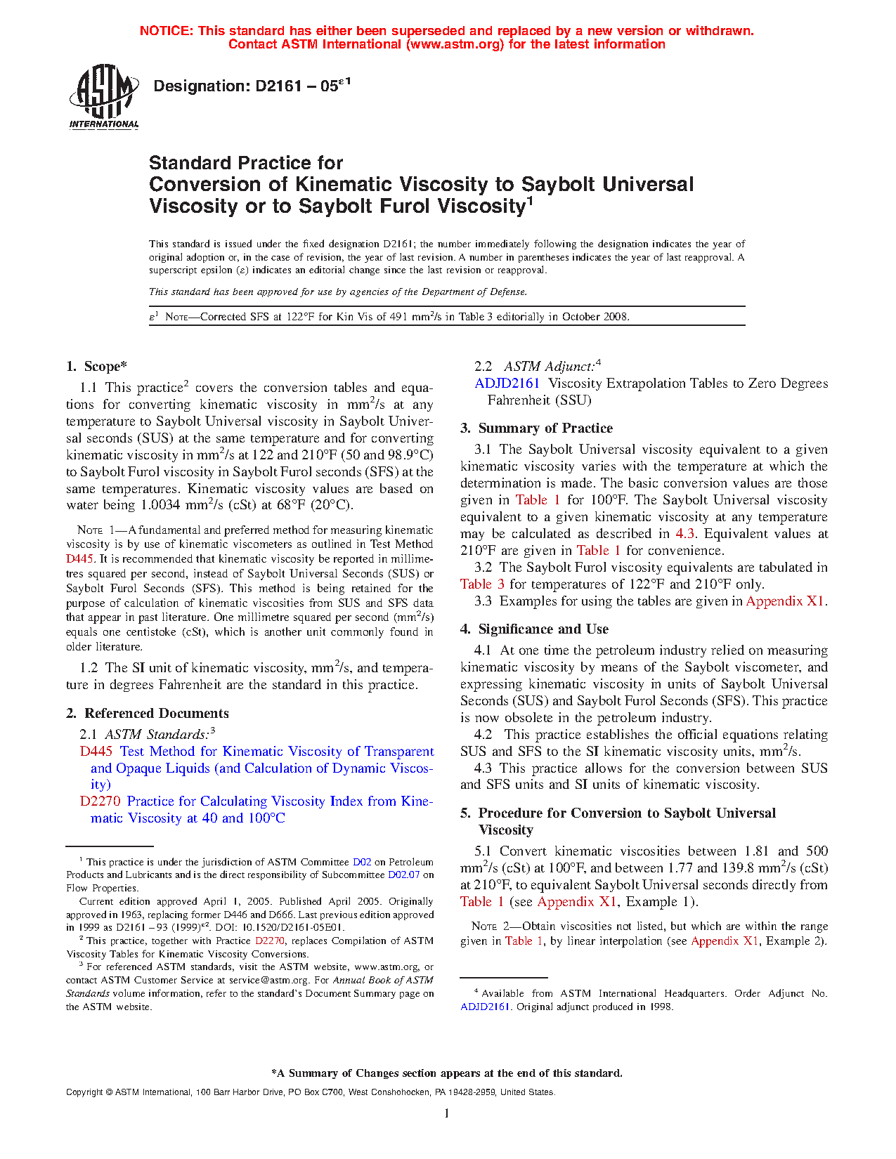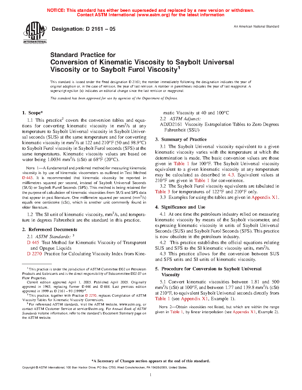 1.1 This practice2 covers the conversion tables and equations for converting kinematic viscosity in mm2/s at any temperature to Saybolt Universal viscosity in Saybolt Universal seconds (SUS) at the same temperature and for converting kinematic viscosity in mm2/s at 122 °F and 210 °F (50 °C and 98.9 °C) to Saybolt Furol viscosity in Saybolt Furol seconds (SFS) at the same temperatures. Kinematic viscosity values are based on water being 1.0034 mm2/s (cSt) at 68 °F (20 °C).