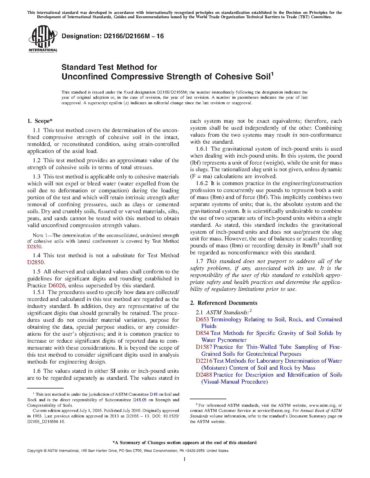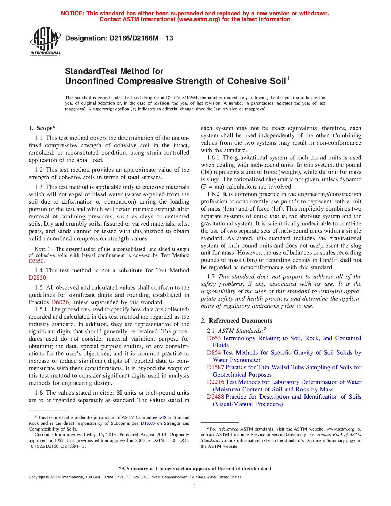 1.1 This test method covers the determination of the unconfined compressive strength of cohesive soil in the intact, remolded, or reconstituted condition, using strain-controlled application of the axial load.
