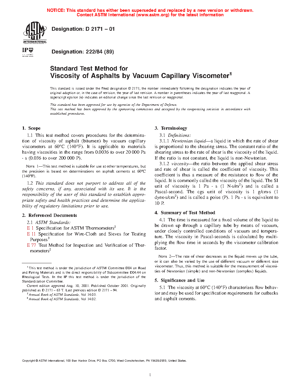 1.1 This test method covers procedures for the determination of viscosity of asphalt binder (bitumen) by vacuum capillary viscometers at 60°C (140°F). It is applicable to materials having viscosities in the range from 0.0036 to over 20 000 Pa · s (0.036 to over 200 000 P).
