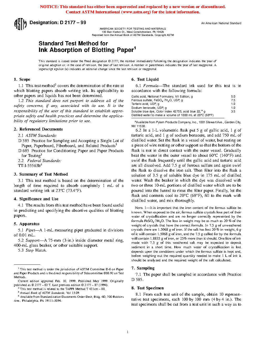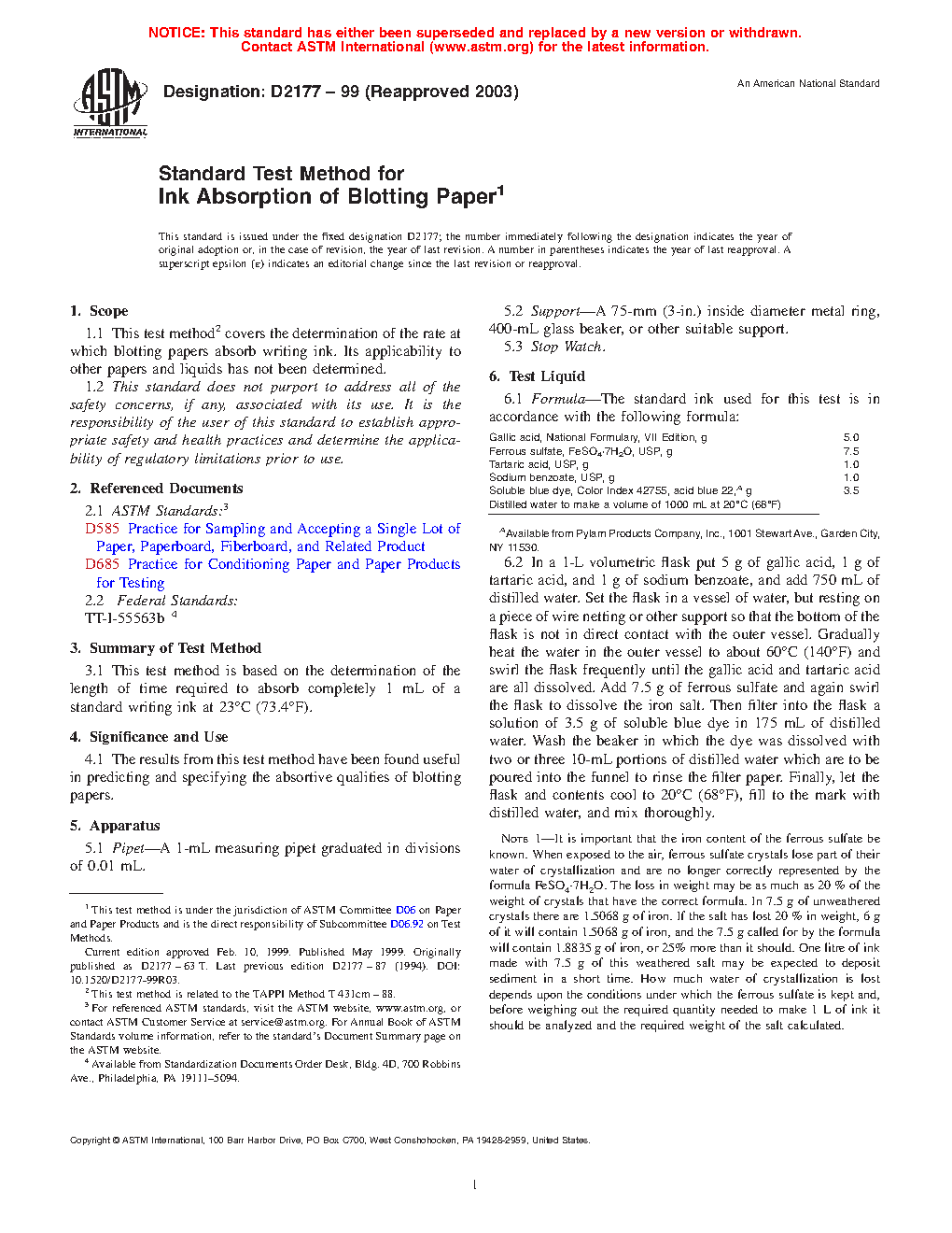 1.1 This test method covers the determination of the rate at which blotting papers absorb writing ink. Its applicability to other papers and liquids has not been determined. It yields results that have been found useful in predicting and specifying the absorptive quality of blotting papers.