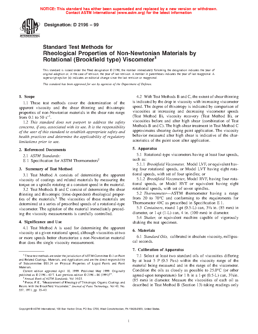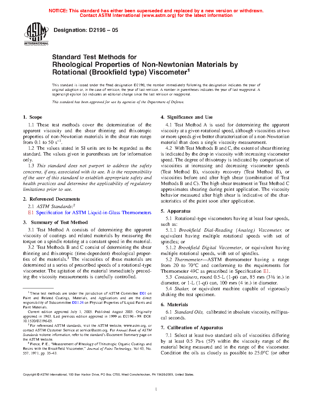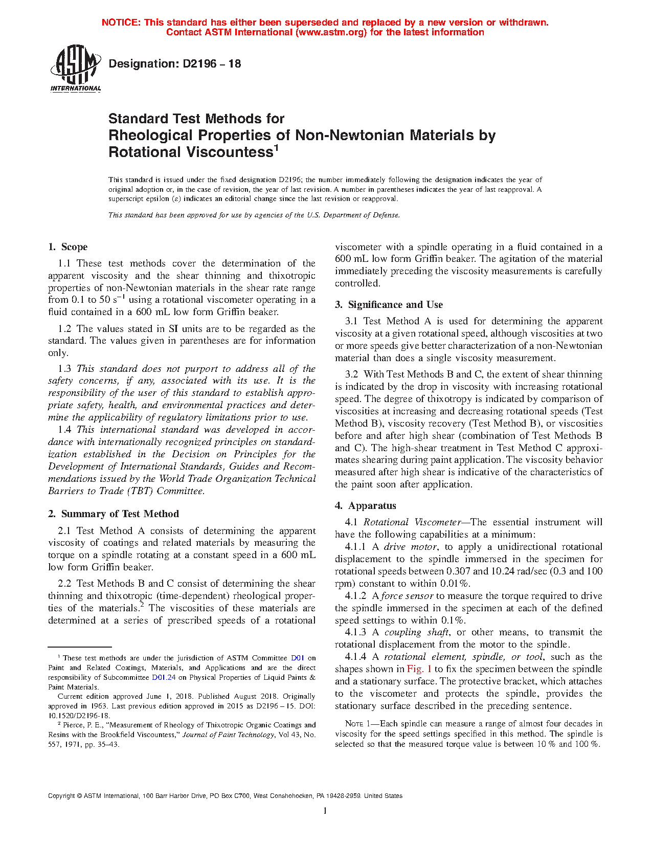 1.1 These test methods cover the determination of the apparent viscosity and the shear thinning and thixotropic properties of non-Newtonian materials in the shear rate range from 0.1 to 50 s−1 using a rotational viscometer operating in a fluid of “infinite” dimensions.
