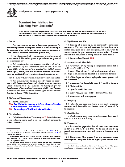 1.1 This test method covers a laboratory procedure for determining whether a sample of sealant will cause staining of the substrate when in the contact with masonry, concrete, or stone (marble, limestone, sandstone, granite, etc.).