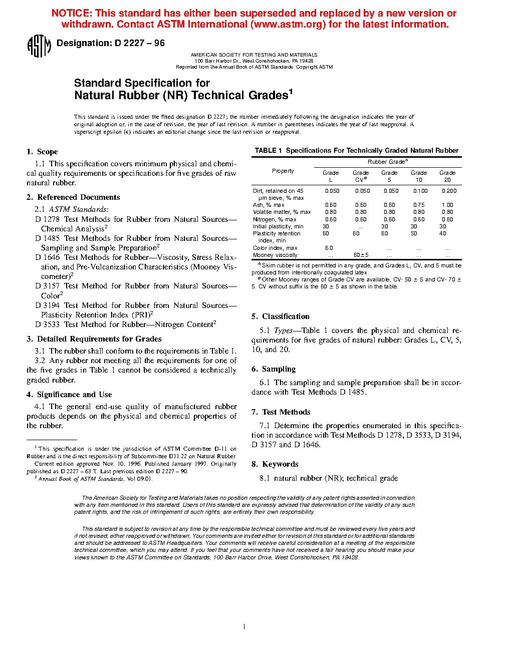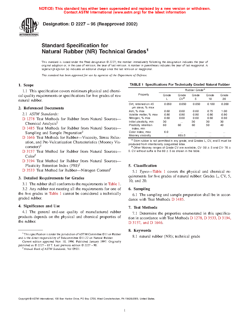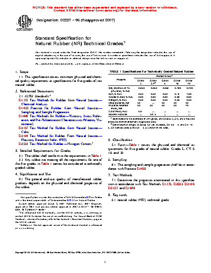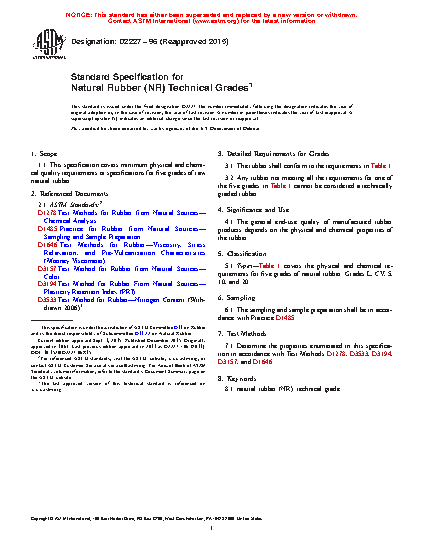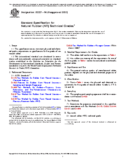 1.1 This specification establishes minimum physical and chemical quality requirements or specifications for five grades of raw natural rubber.