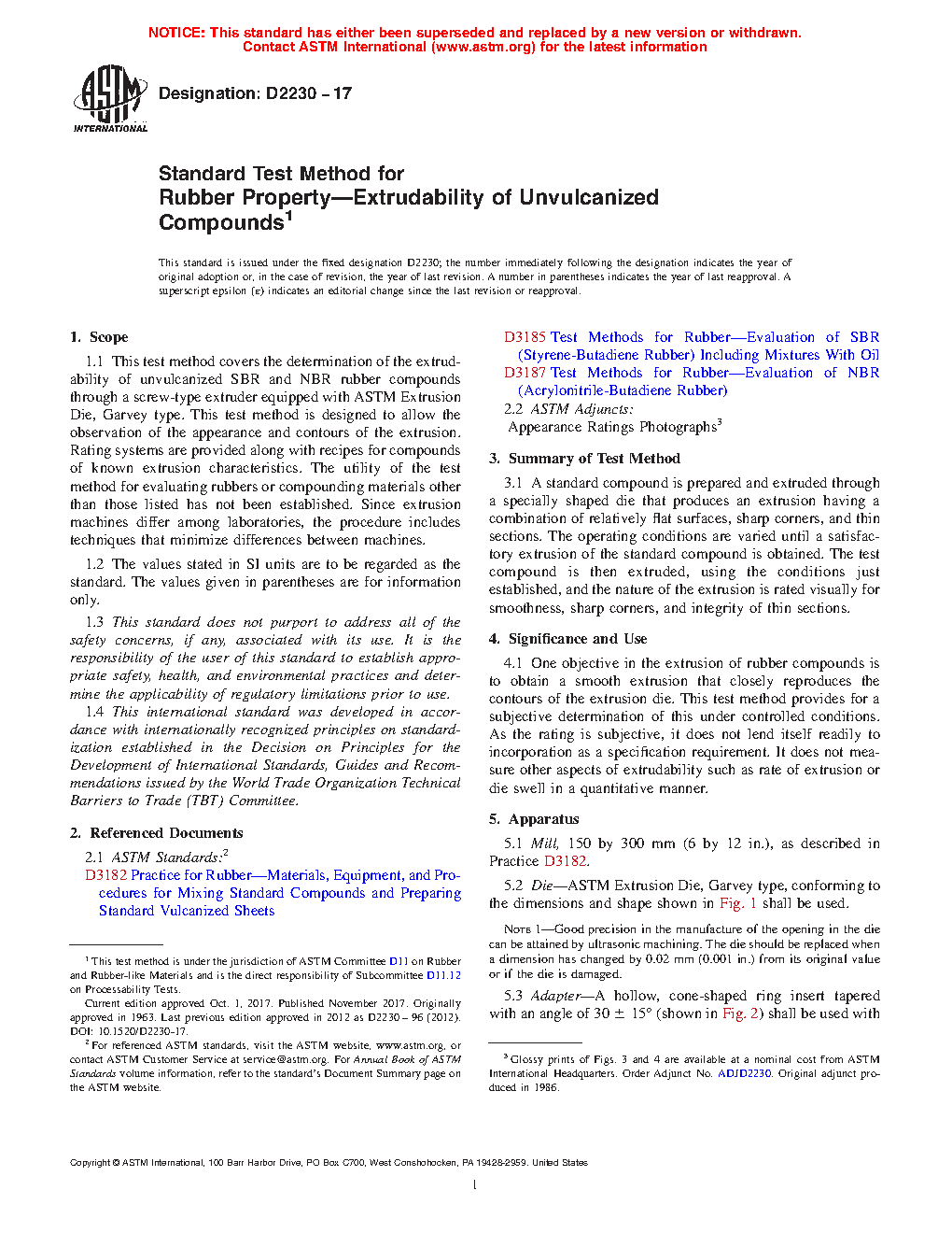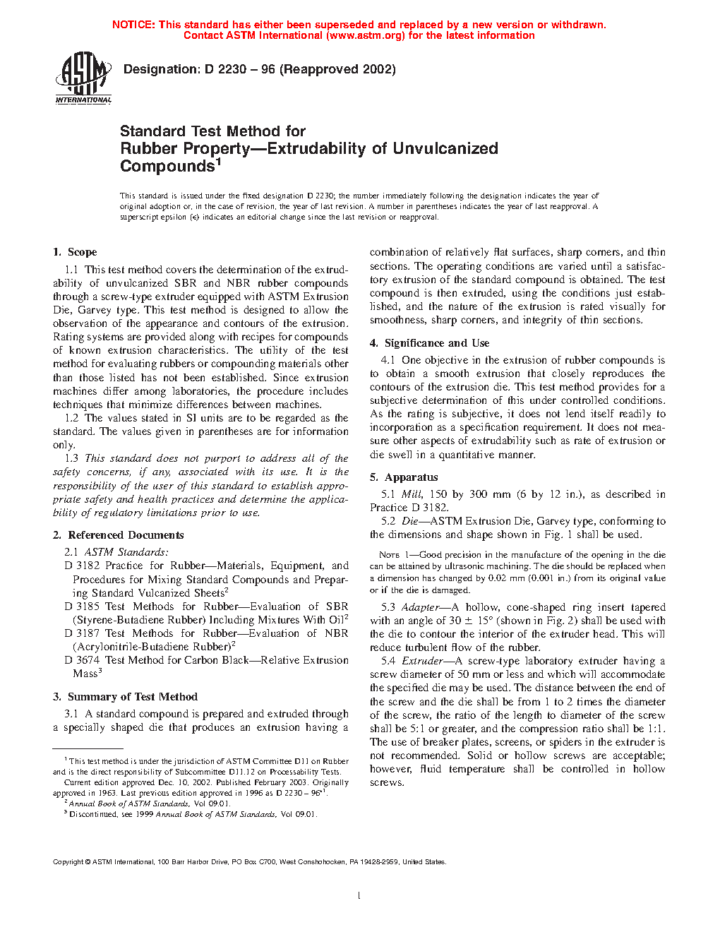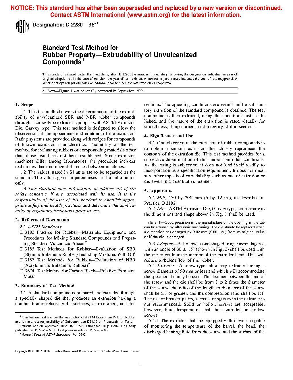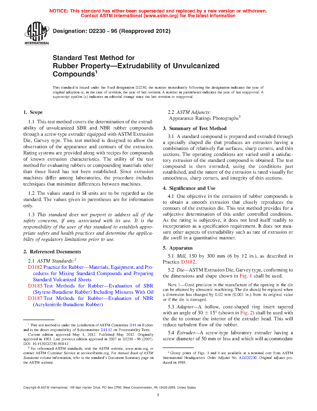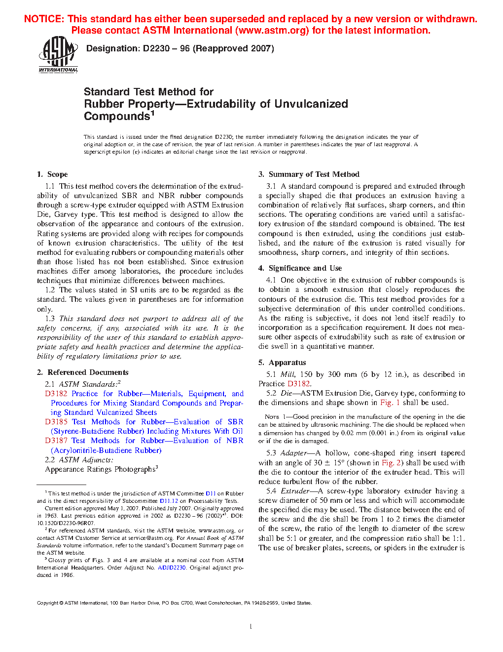 1.1 This test method covers the determination of the extrudability of unvulcanized SBR and NBR rubber compounds through a screw-type extruder equipped with ASTM Extrusion Die, Garvey type. This test method is designed to allow the observation of the appearance and contours of the extrusion. Rating systems are provided along with recipes for compounds of known extrusion characteristics. The utility of the test method for evaluating rubbers or compounding materials other than those listed has not been established. Since extrusion machines differ among laboratories, the procedure includes techniques that minimize differences between machines.