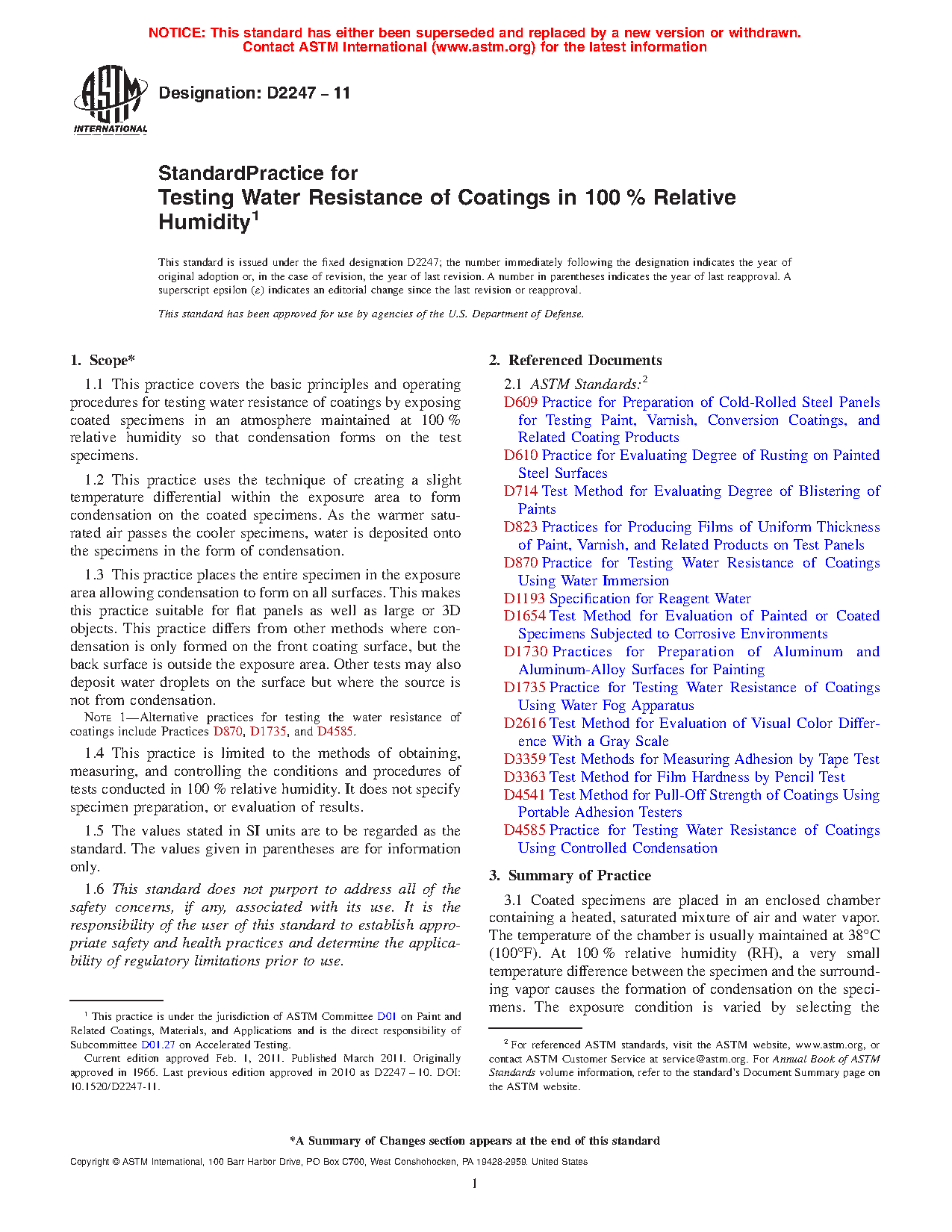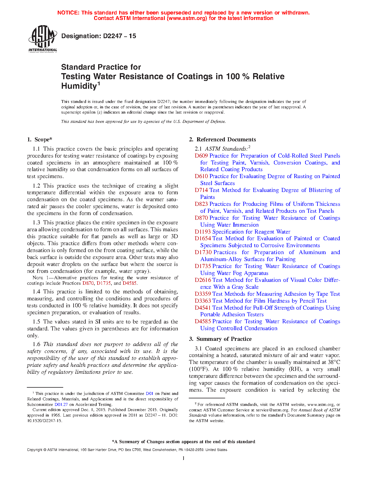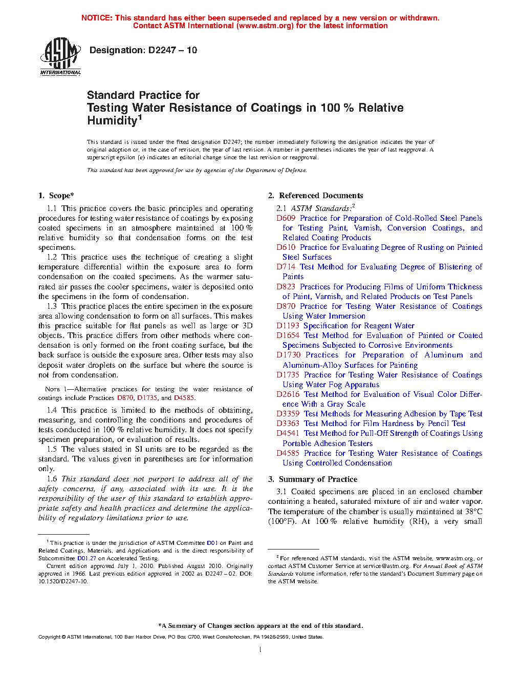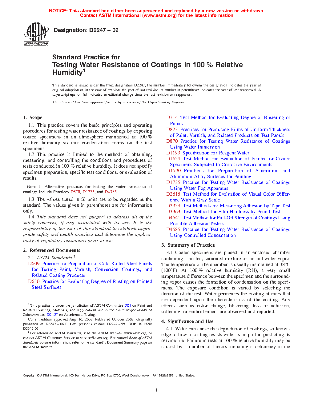 Note 1: Alternative practices for testing the water resistance of coatings include Practices D870, D1735, and D4585.