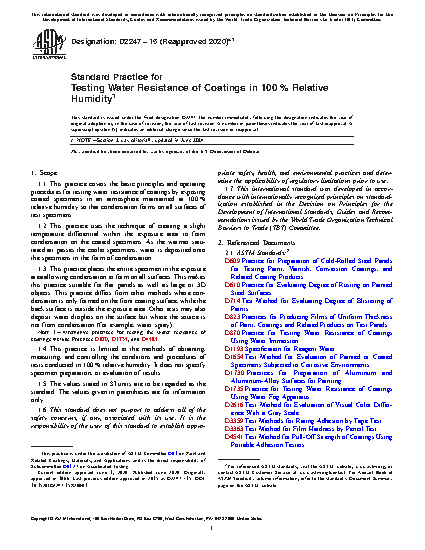 1.1 This practice covers the basic principles and operating procedures for testing water resistance of coatings by exposing coated specimens in an atmosphere maintained at 100 % relative humidity so that condensation forms on all surfaces of test specimens.