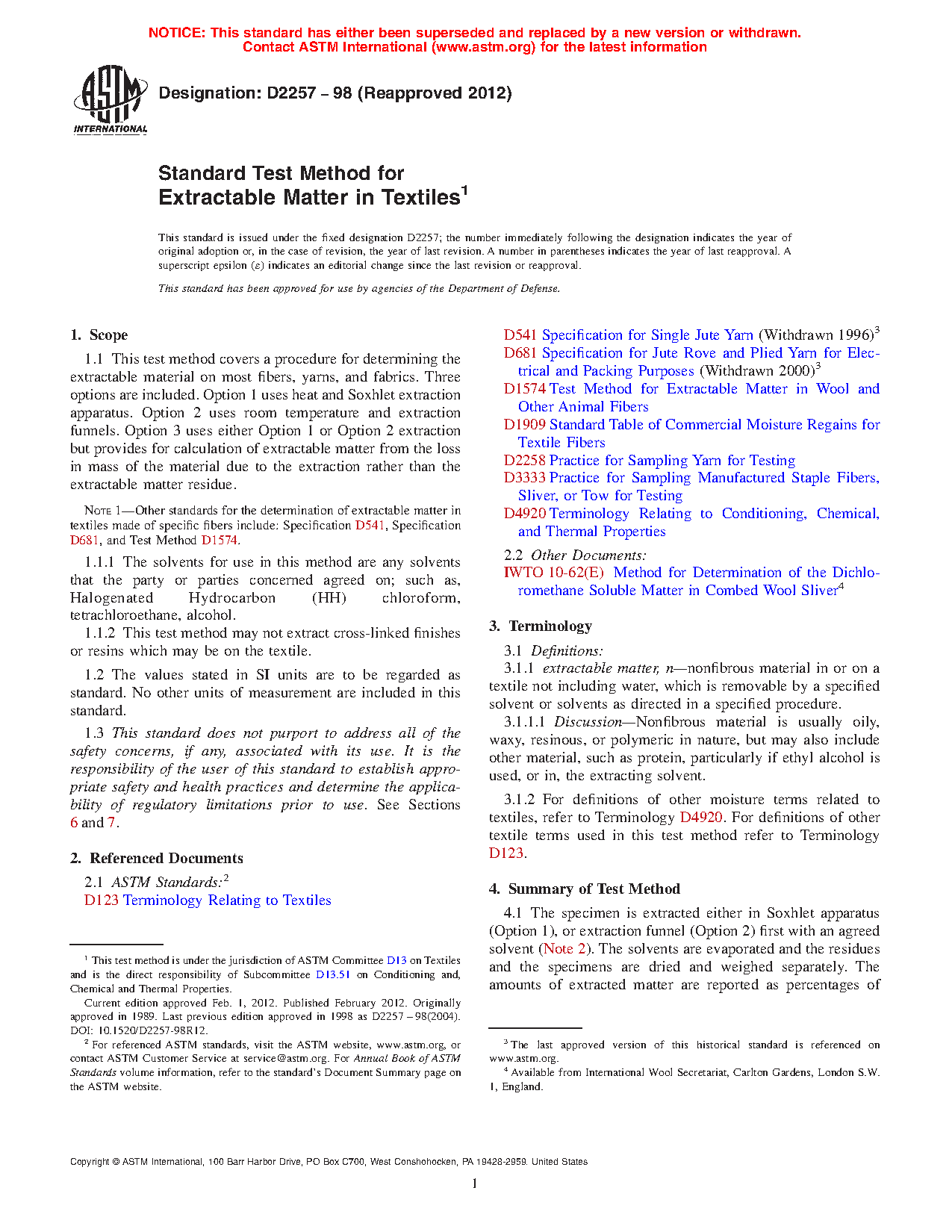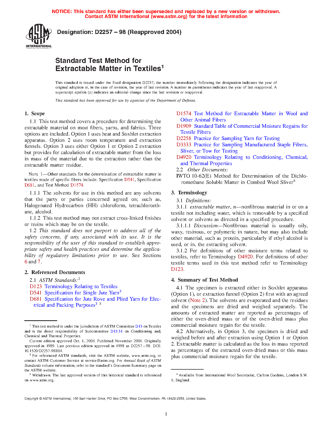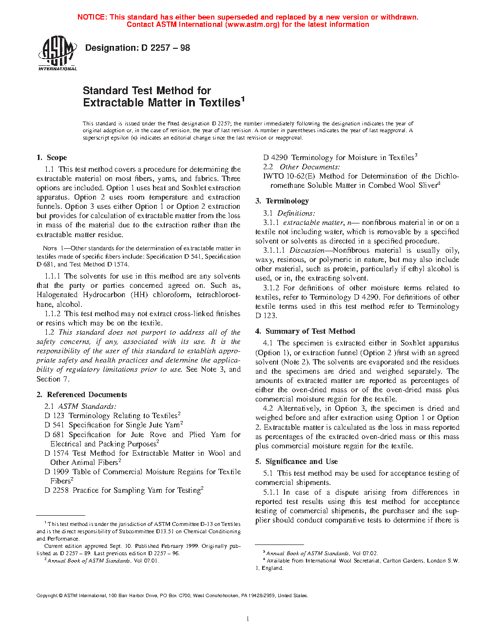 Note 1: Other standards for the determination of extractable matter in textiles made of specific fibers include: Specification D541, Specification D681, and Test Method D1574.