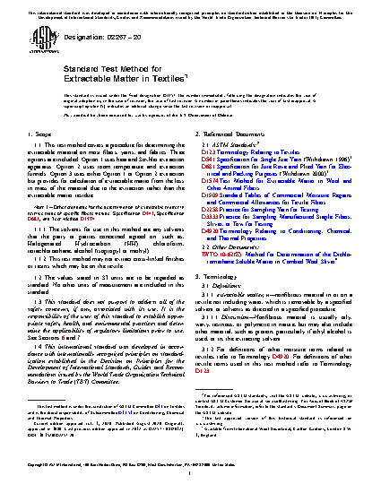 1.1 This test method covers a procedure for determining the extractable material on most fibers, yarns, and fabrics. Three options are included. Option 1 uses heat and Soxhlet extraction apparatus. Option 2 uses room temperature and extraction funnels. Option 3 uses either Option 1 or Option 2 extraction but provides for calculation of extractable matter from the loss in mass of the material due to the extraction rather than the extractable matter residue.