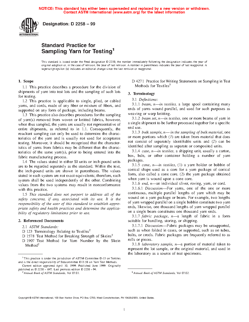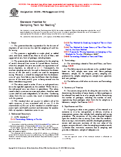 1.3 This practice also describes procedures for the sampling of yarn(s) removed from woven or knitted fabrics, however, when thus sampled, the yarns are usually not representative of entire shipments, as referred to in 1.1. Consequently, the resultant sampling can only be used to determine the characteristics of the yarn and is usually not used for acceptance testing. Moreover, it should be recognized that the characteristics of yarns from fabrics may be different than the characteristics of the same yarn(s), prior to being entered into the fabric manufacturing process.