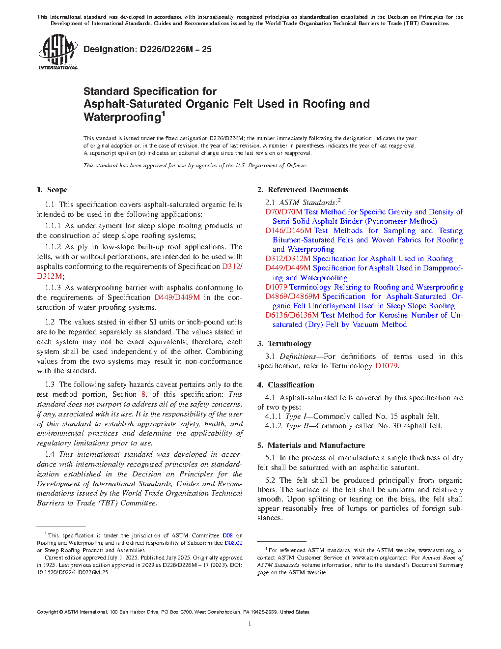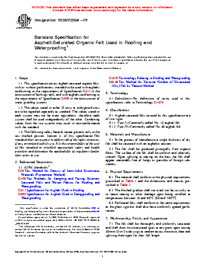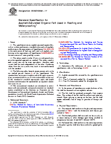 1.1 This specification covers asphalt-saturated organic felts, with or without perforations, intended to be used with asphalts conforming to the requirements of Specification D312/D312M in the construction of built-up roofs, and with asphalts conforming to the requirements of Specification D449/D449M in the construction of water proofing systems.