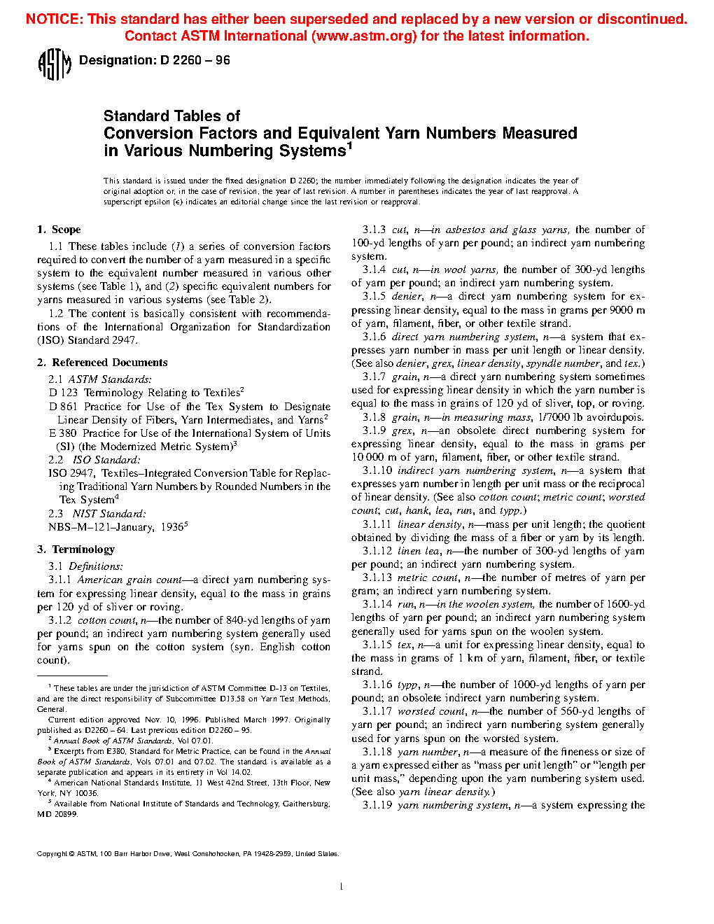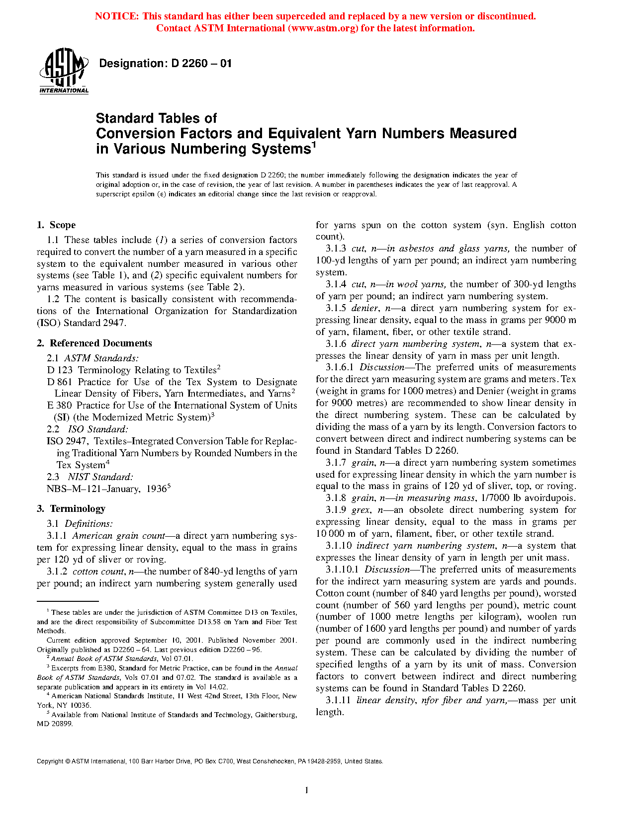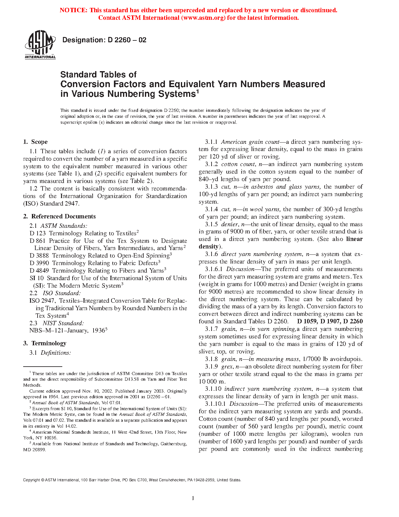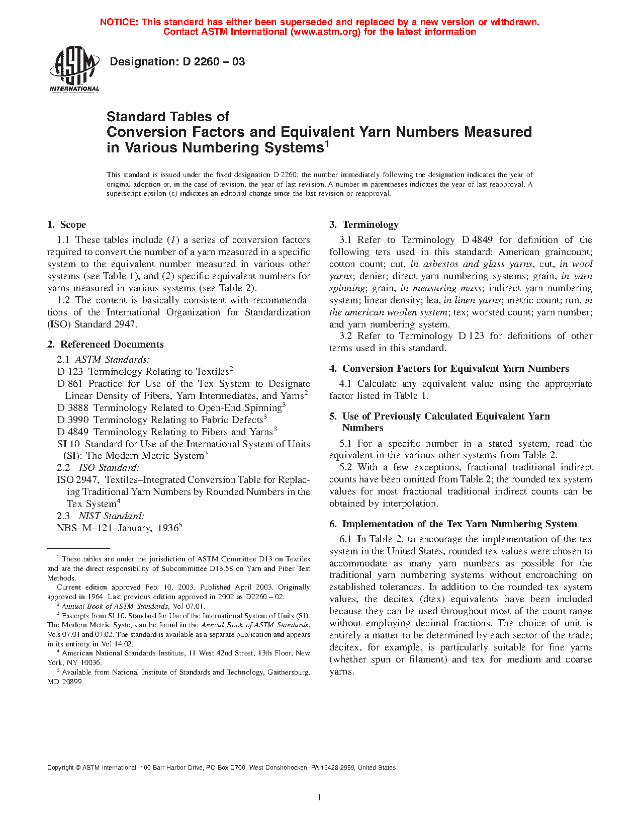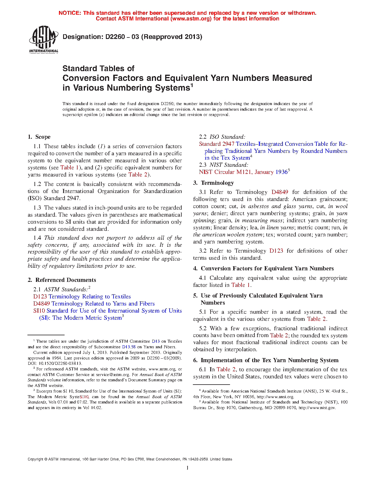 1.1 These tables include (1) a series of conversion factors required to convert the number of a yarn measured in a specific system to the equivalent number measured in various other systems (see Table 1), and (2) specific equivalent numbers for yarns measured in various systems (see Table 2).