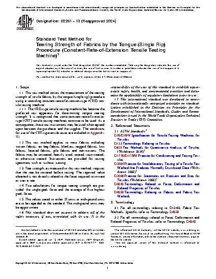 1.1 This test method covers the measurement of the tearing strength of textile fabrics by the tongue (single rip) procedure using a recording constant-rate-of-extension-type (CRE) tensile testing machine.