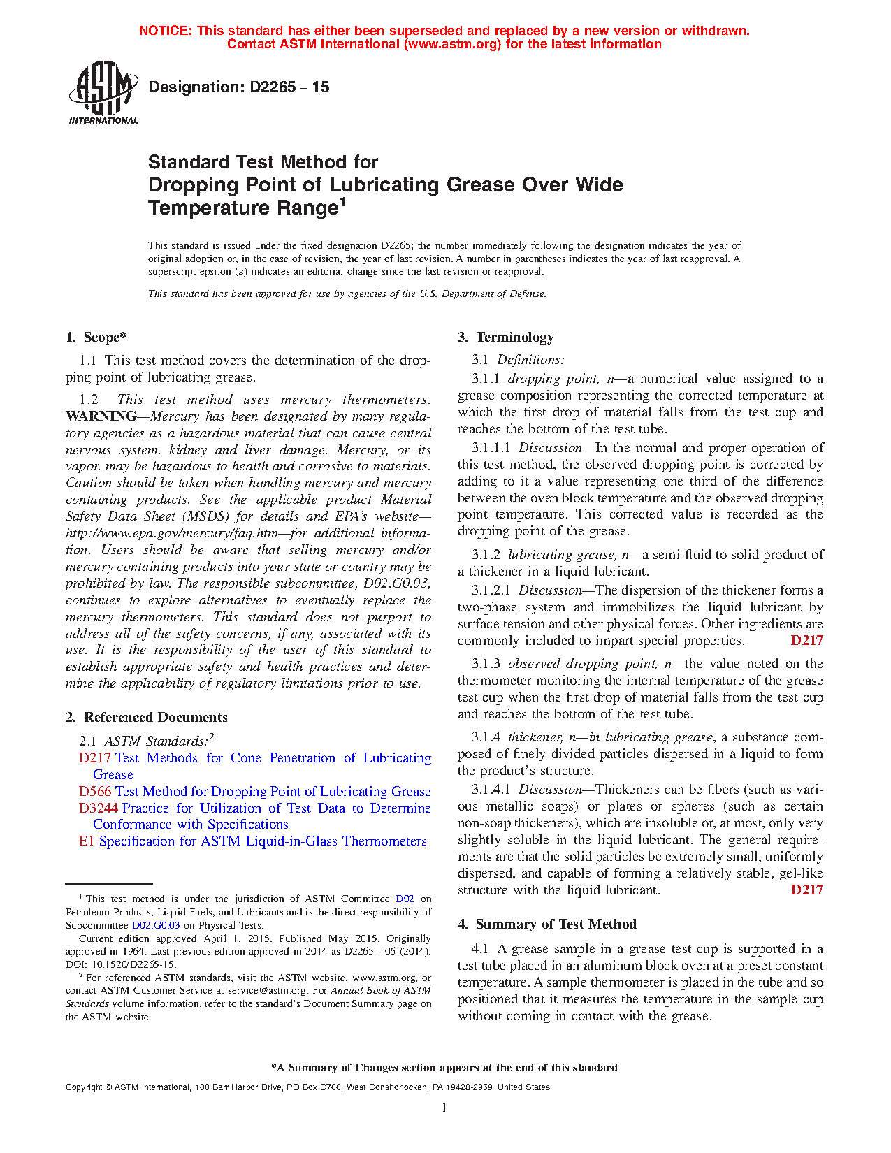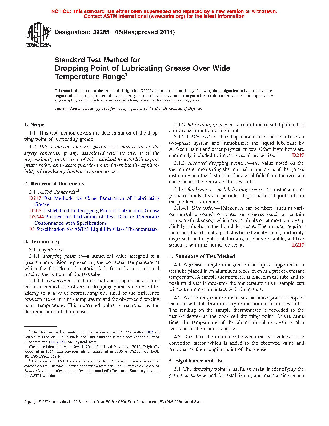 5.2 Cooperative testing3 indicates that, in general, dropping points by Test Method D2265 and Test Method D566 are in agreement up to 260 °C. In cases where results differ, there is no known significance. However, agreement between the manufacturer and purchaser as to test method used is advisable.