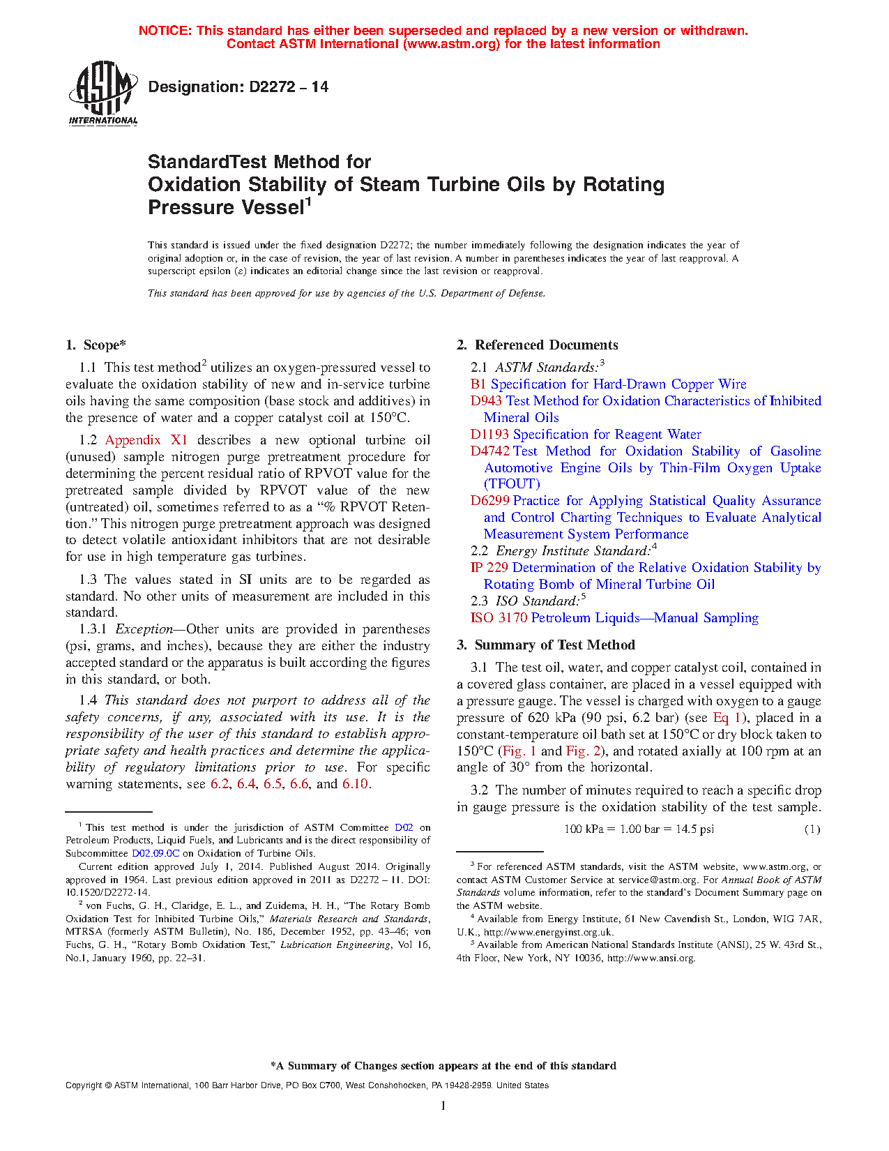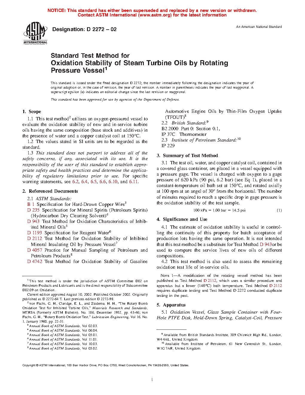 1.1 This test method2 utilizes an oxygen-pressured vessel to evaluate the oxidation stability of new and in-service turbine oils having the same composition (base stock and additives) in the presence of water and a copper catalyst coil at 150°C.