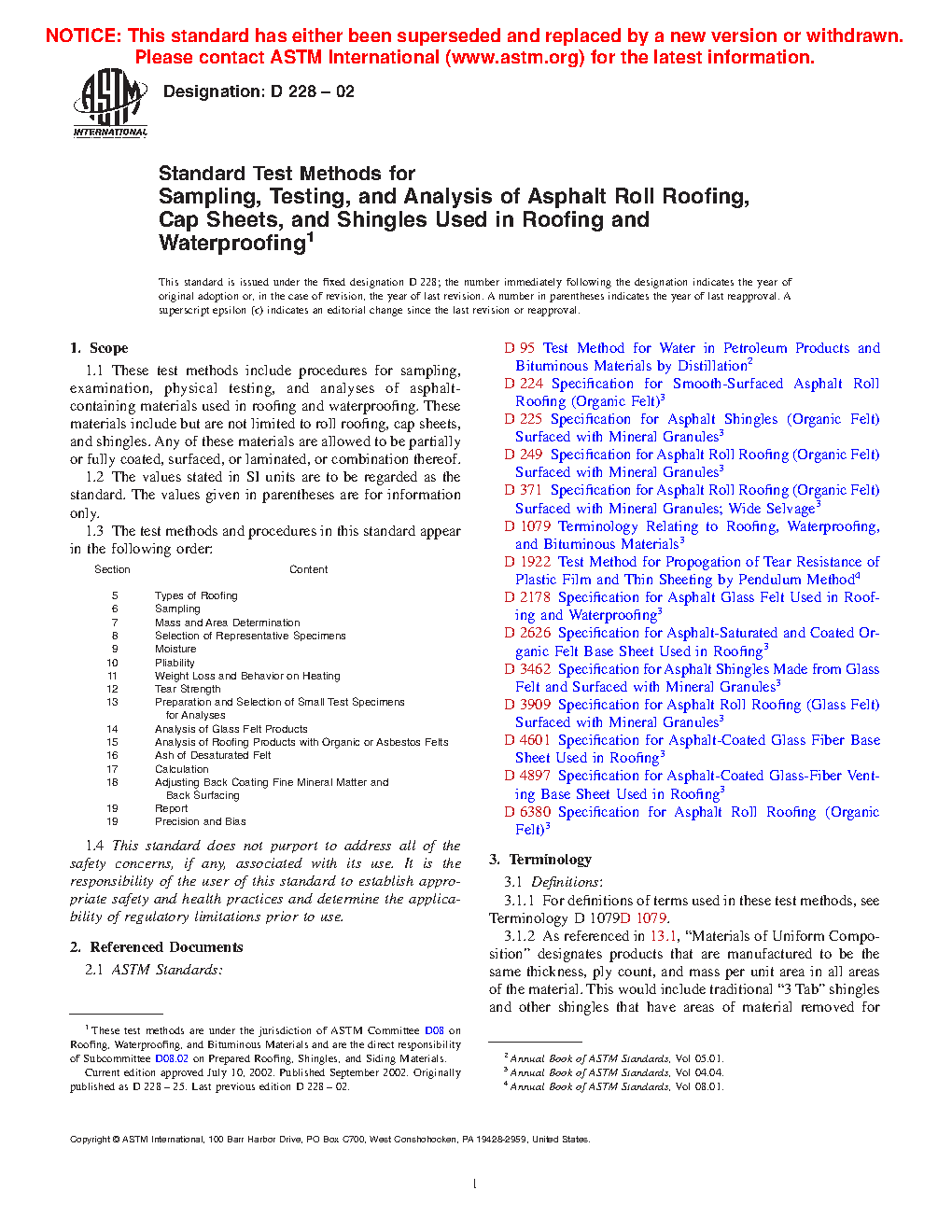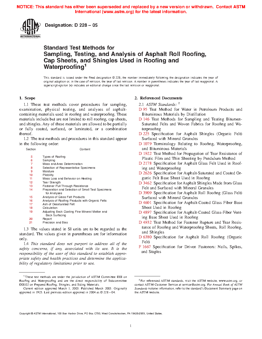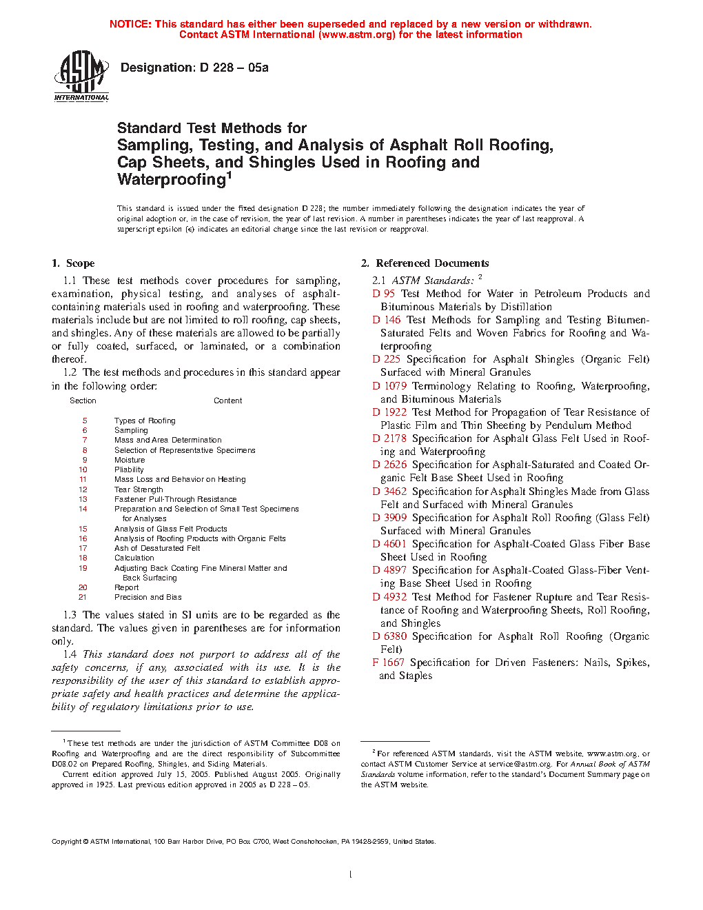 These test methods include procedures for sampling, examination, physical testing, and analyses of asphalt roll roofing, cap sheets, and shingles used in roofing and waterproofing. Other components of these materials are allowed to include, but are not limited to, felts, mats, films, foils, mineral stabilizers, papers, and mineral surfacing.