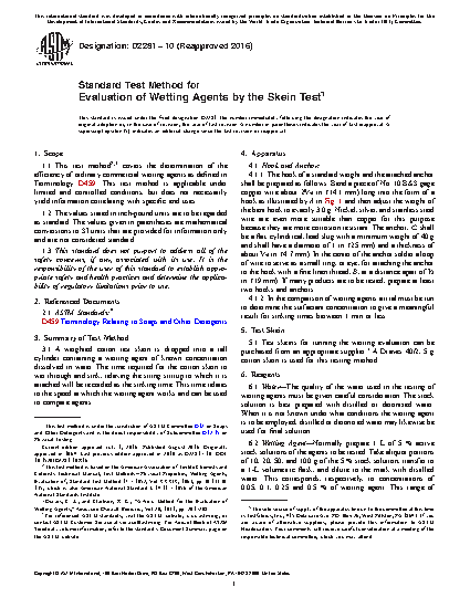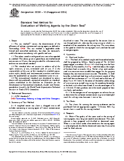 1.1 This test method2,3 covers the determination of the efficiency of ordinary commercial wetting agents as defined in Terminology D459. This test method is applicable under limited and controlled conditions, but does not necessarily yield information correlating with specific end uses.