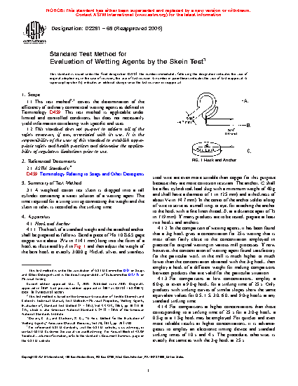 This test method covers the determination of the efficiency of ordinary commercial wetting agents using the skein test. It is applicable under limited and controlled conditions, but does not necessarily yield information correlating with specific end uses. The apparatus is comprised of a hook of standard weight depending on the concentration of the wetting agents and an anchor which shall be a flat, cylindrical, lead slug of specific dimensions. The reagents shall consist of water, acid and base test solutions, and wetting agent. The average of at least four determinations of the sinking time for each concentration of wetting agent shall be obtained and presented in plots with logarithmic coordinates. Standard deviation based on six replicate determinations shall also be calculated for precision.