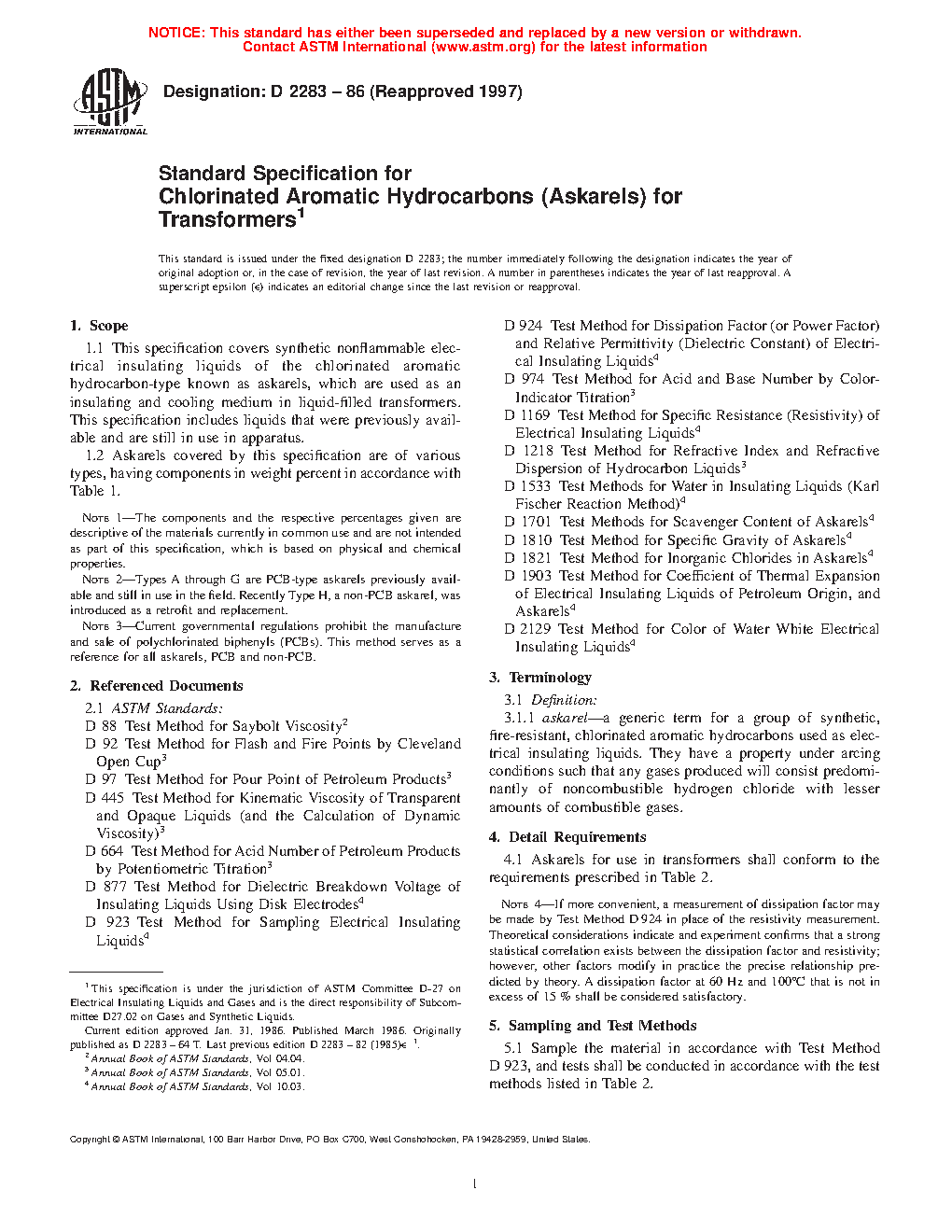 Note 1-The components and the respective percentages given are descriptive of the materials currently in common use and are not intended as part of this specification, which is based on physical and chemical properties. Note 2-Types A through G are PCB-type askarels previously available and still in use in the field. Recently Type H, a non-PCB askarel, was introduced as a retrofit and replacement. Note 3-Current governmental regulations prohibit the manufacture and sale of polychlorinated biphenyls (PCBs). This method serves as a reference for all askarels, PCB and non-PCB.Technical characteristics
