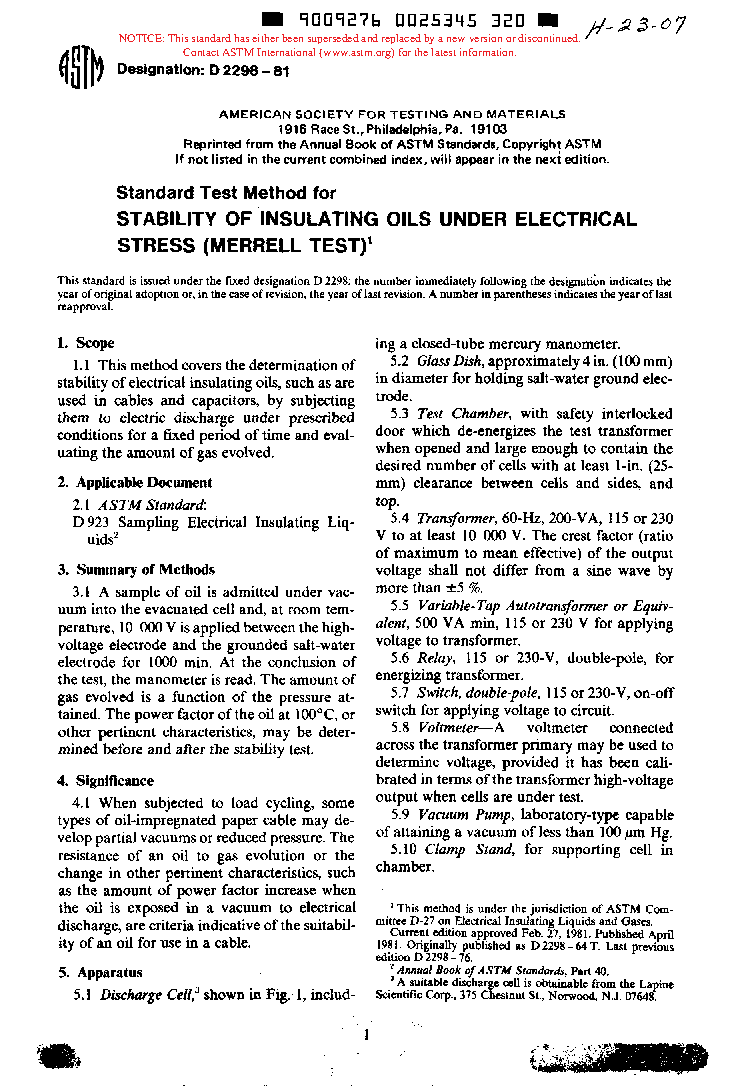Method of Test for Stability of Insulating Oils Under Electrical Stress (Merrell Test) (Withdrawn 1986)