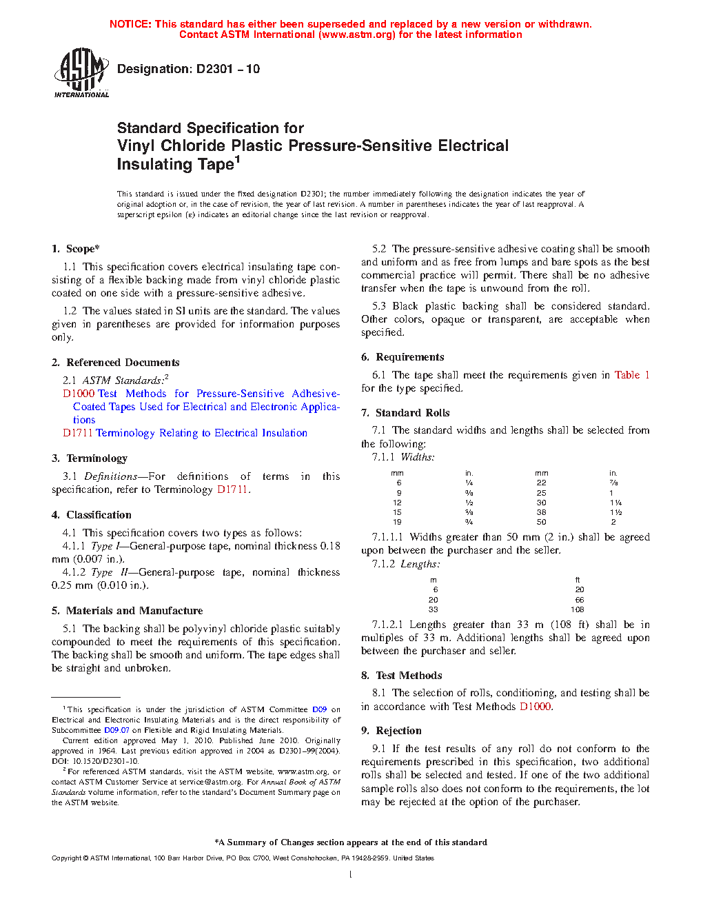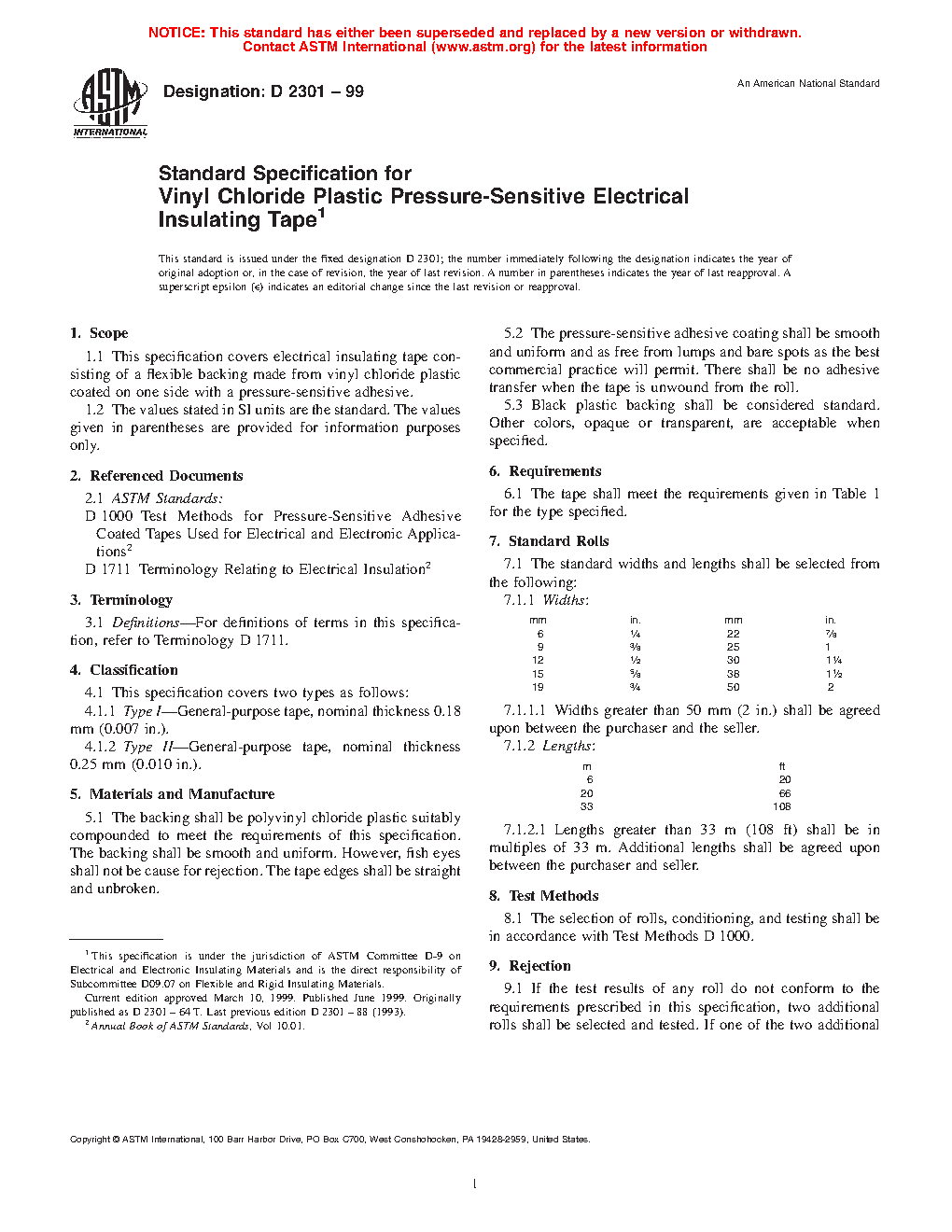 This specification covers electrical insulating tape consisting of a flexible backing made from vinyl chloride plastic coated on one side with a pressure-sensitive adhesive. The tape shall be classified according to thickness: Type I and Type II. The backing shall be polyvinyl chloride plastic suitably compounded to meet the requirements of this specification. The backing shall be smooth and uniform. The selection of rolls, conditioning, and testing shall be in accordance with the specified requirements.