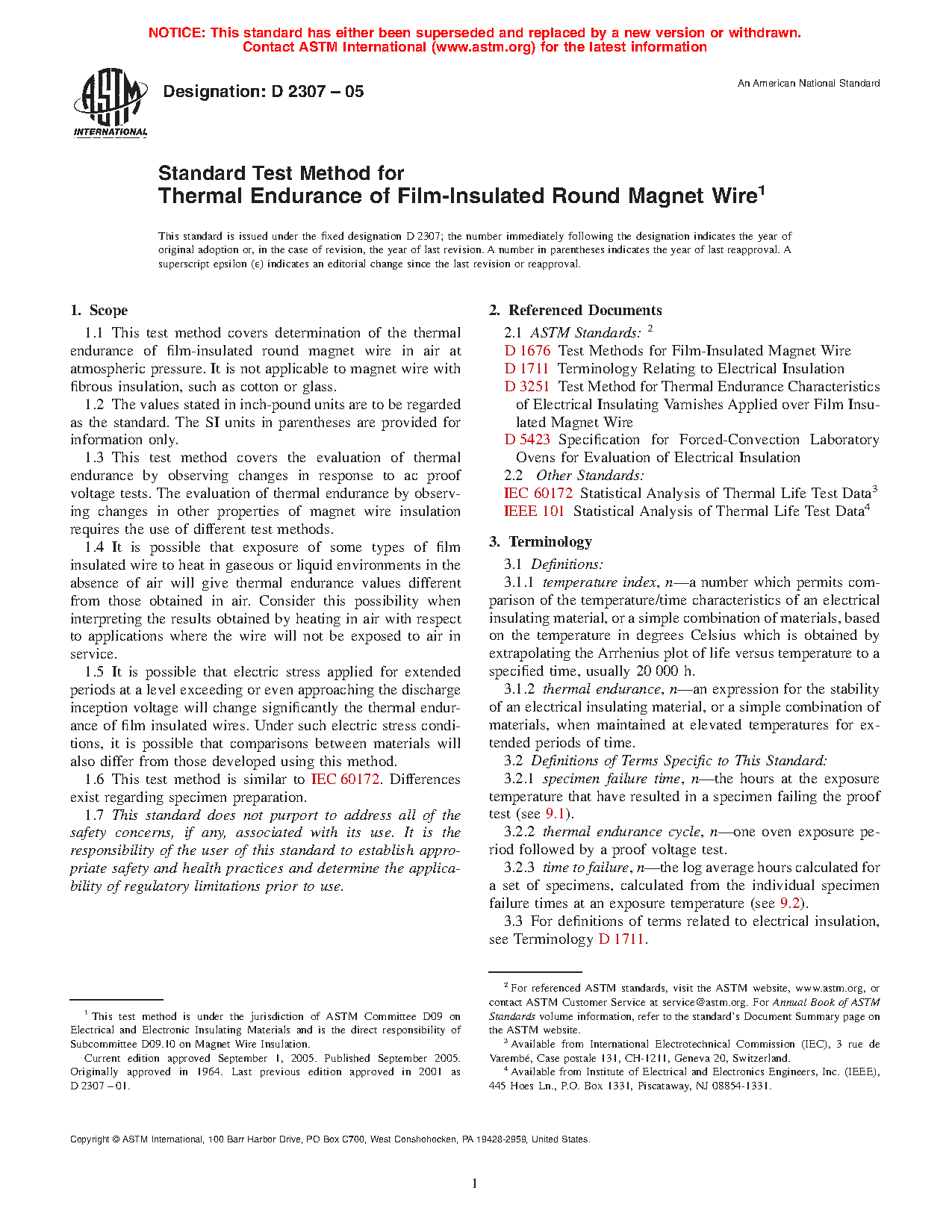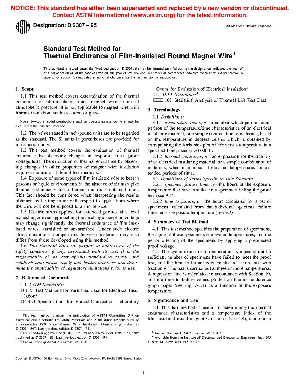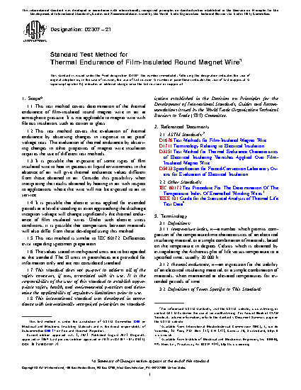 1.1 This test method covers determination of the thermal endurance of film-insulated round magnet wire in air at atmospheric pressure. It is not applicable to magnet wire with fibrous insulation, such as cotton or glass.