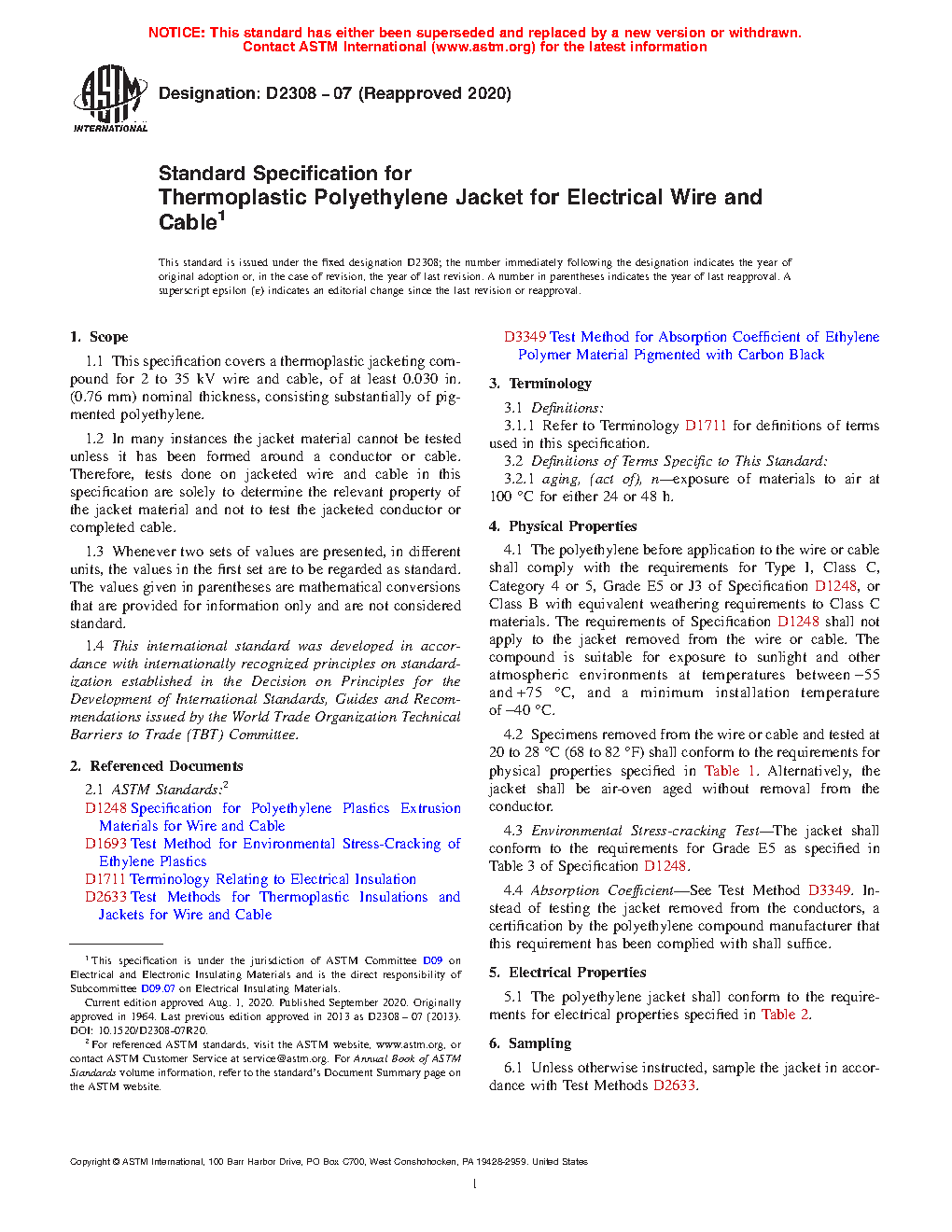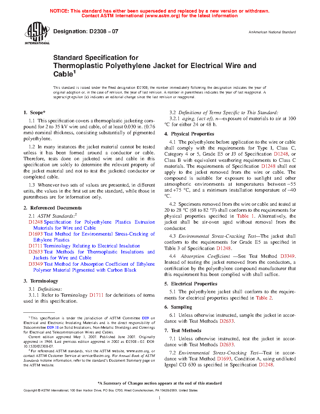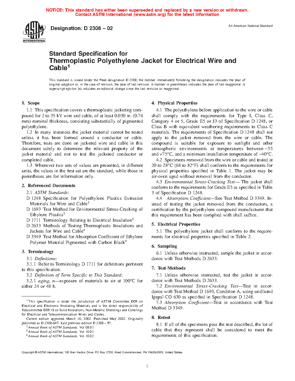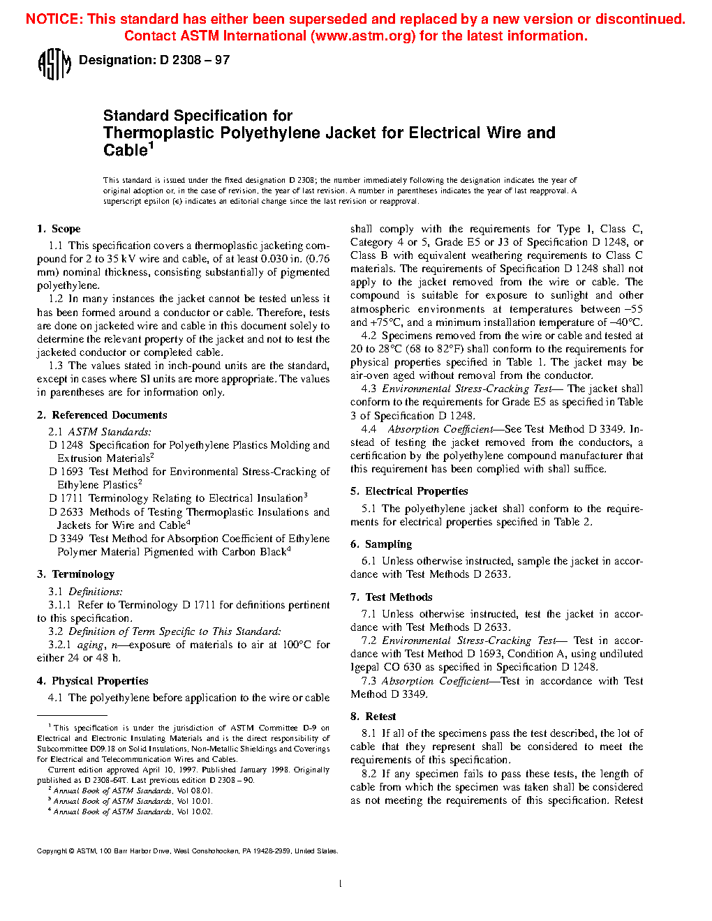 This specification covers a thermoplastic jacketing compound substantially consisting of pigmented polyethylene for use in electrical wires and cables with specified nominal thicknesses and operating at specified voltages. Since the jacket material cannot be tested unless it has been formed around a conductor or cable, tests shall then be done on jacketed wires and cables solely to determine the relevant property of the jacket material and not to test the jacketed conductor or completed cable. Materials shall be suitably sampled and tested, and shall conform accordingly to the following physical and electrical properties: unaged tensile strength and elongation at rupture; tensile strength and elongation at rupture after air oven aging; absorption coefficient; heat distortion; environmental stress-cracking; surface resistivity; and U-bend discharge.