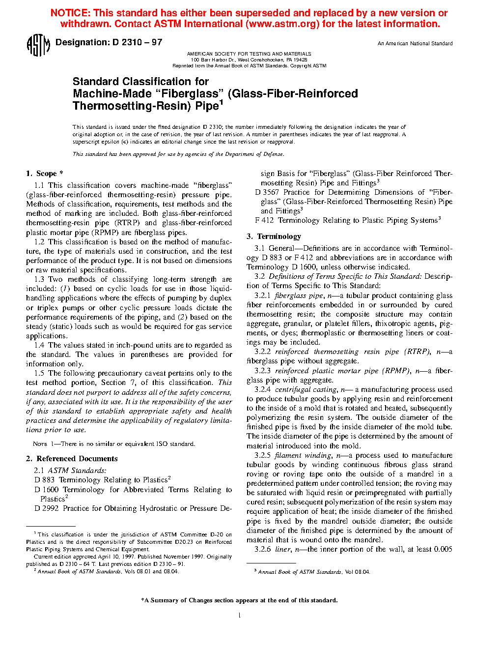 1.1 This classification covers machine-made “fiberglass” (glass-fiber-reinforced thermosetting-resin) pressure pipe. Methods of classification, requirements, test methods and the method of marking are included. Both glass-fiber-reinforced thermosetting-resin pipe (RTRP) and glass-fiber-reinforced polymer mortar pipe (RPMP) are fiberglass pipes.