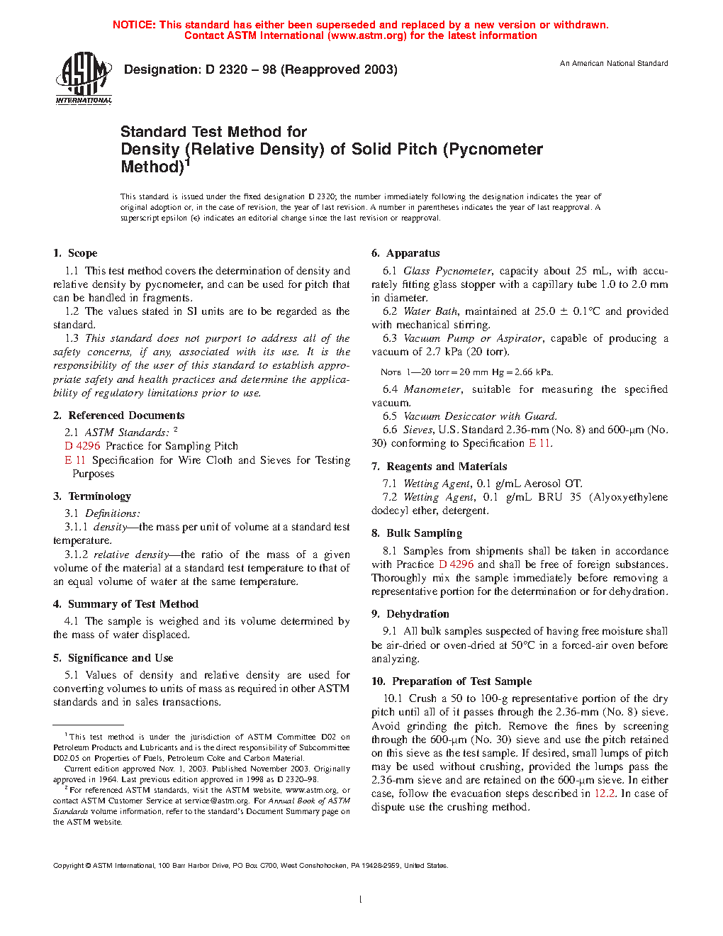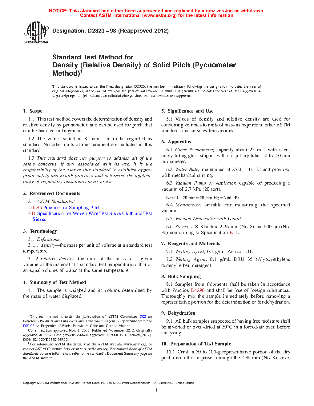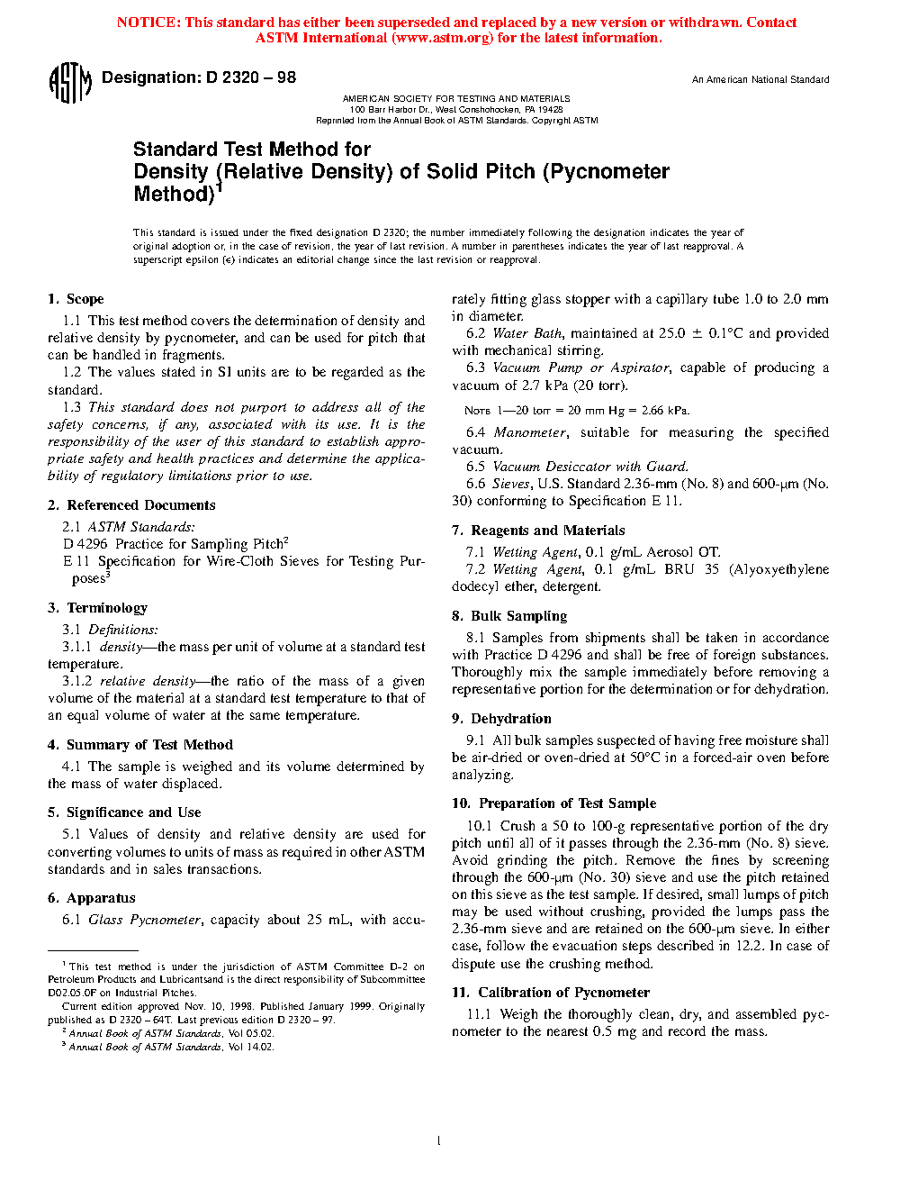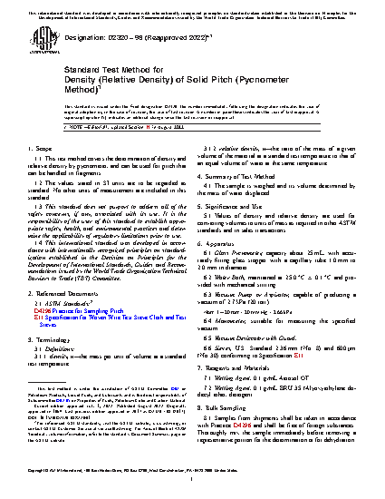 1.1 This test method covers the determination of density and relative density by pycnometer, and can be used for pitch that can be handled in fragments.