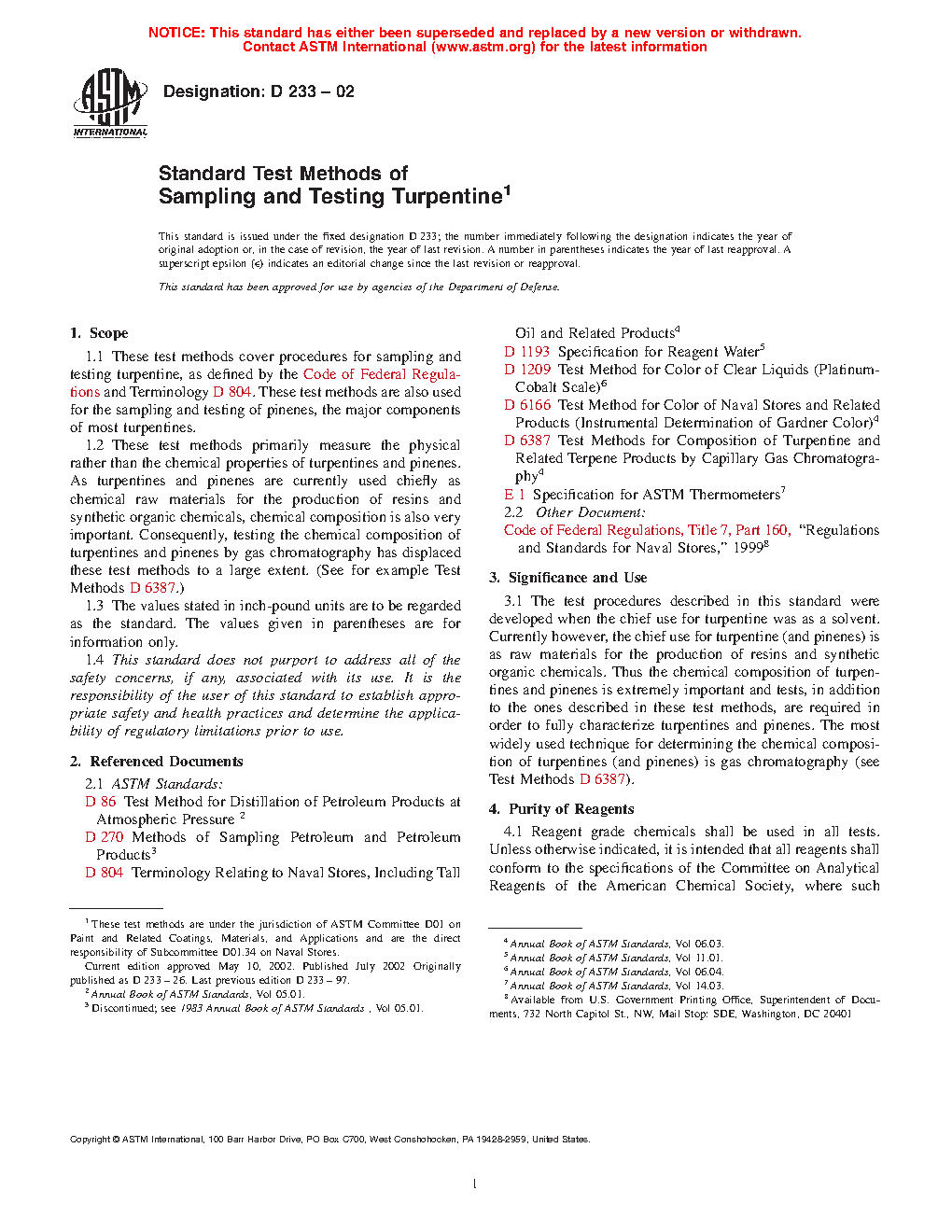 1.1 These test methods cover procedures for sampling and testing turpentine, as defined by the Code of Federal Regulations and Terminology D804. These test methods are also used for the sampling and testing of pinenes, the major components of most turpentines.