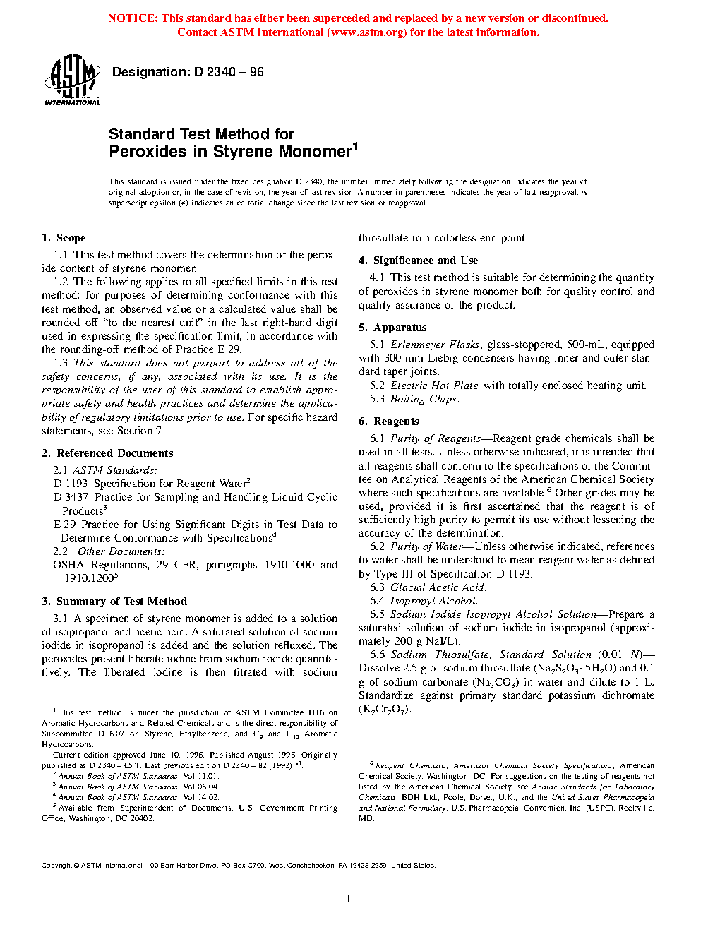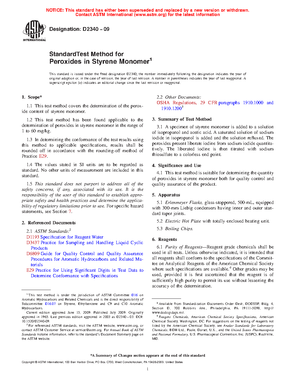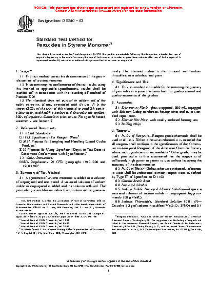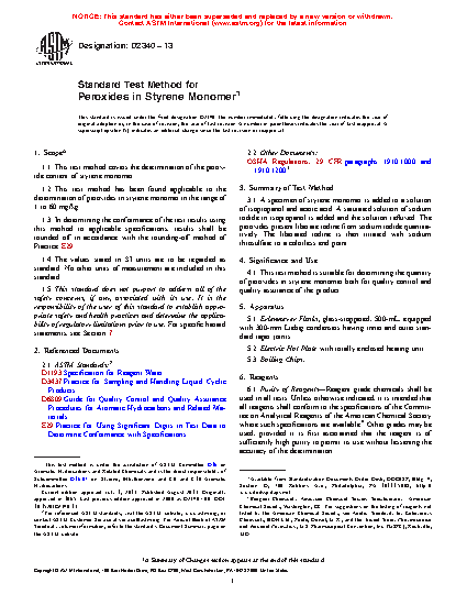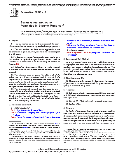 This test method is suitable for determining the quantity of peroxides in styrene monomer both for quality control and quality assurance of the product.