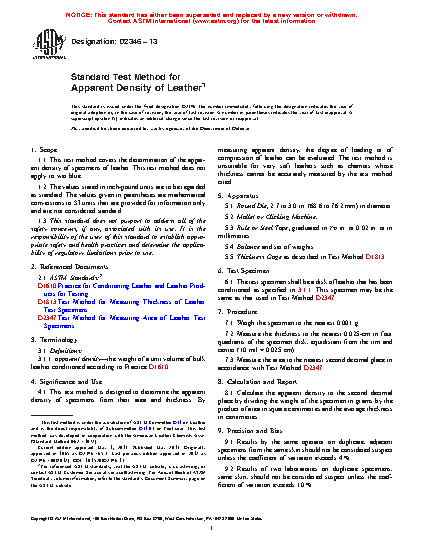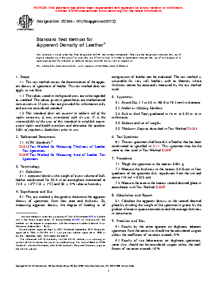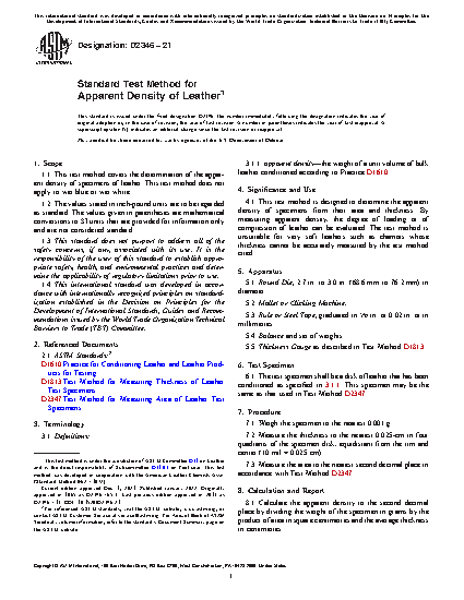 1.1 This test method covers the determination of the apparent density of specimens of leather. This test method does not apply to wet blue.
