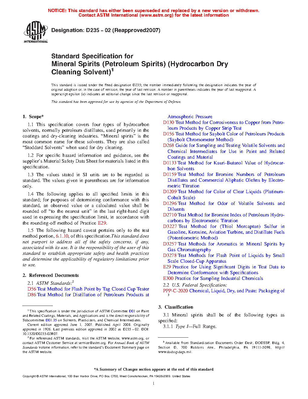 1.1 This specification covers four types of hydrocarbon solvents, normally petroleum distillates, used primarily in the coatings and dry-cleaning industries. “Mineral spirits” is the most common name for these solvents. They are also called “Stoddard Solvents” when used for dry cleaning.